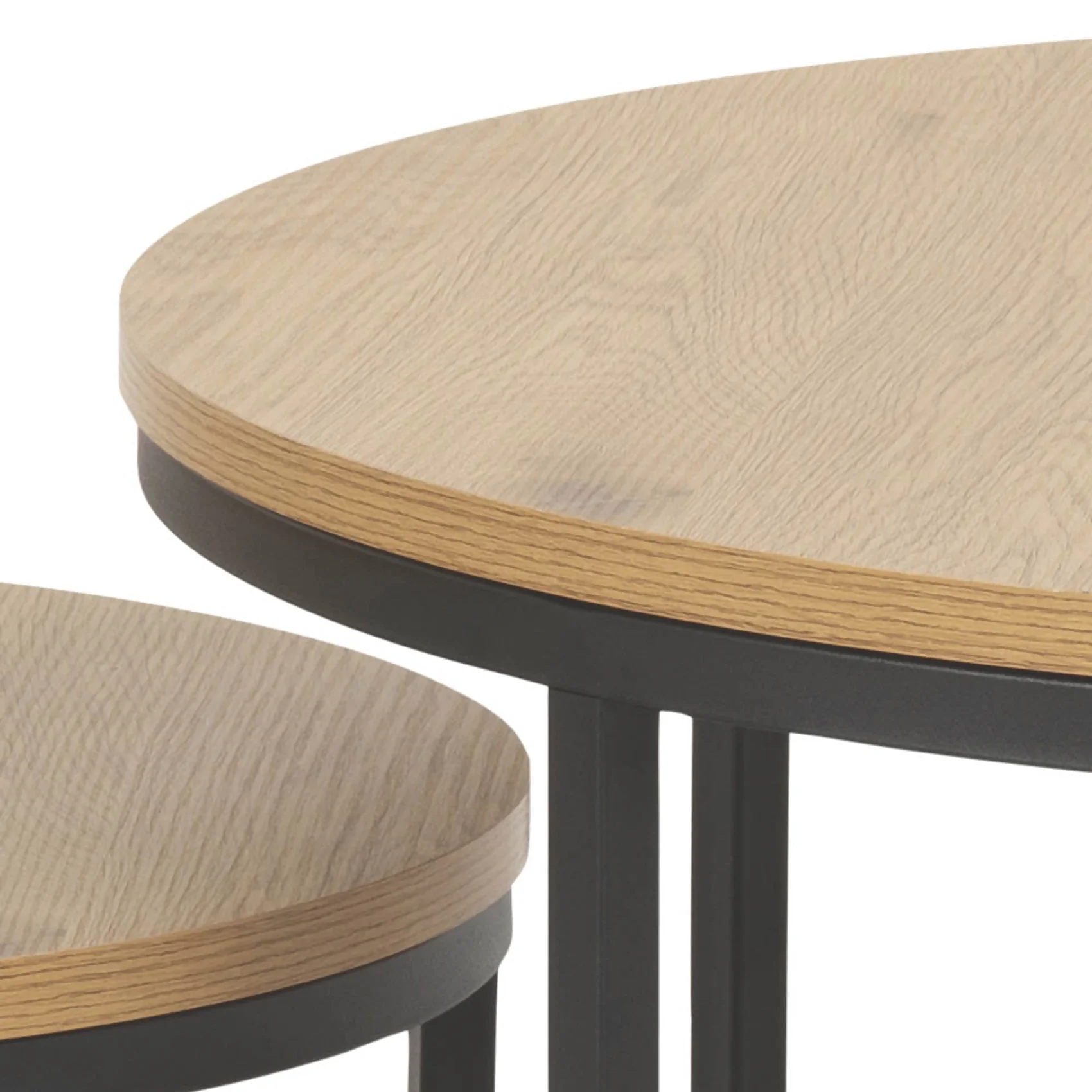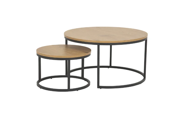 Dieser moderne Couchtisch-Set besteht aus zwei Tischen mit Platten in Wildeiche Nachbildung und einem Gestell aus schwarz matt lackiertem Metall. Die größeren Tisch misst D ca. 80 cm und ist ca. 45 cm hoch, während der kleinere Tisch D ca. 50 cm und ca. 33 cm hoch ist.