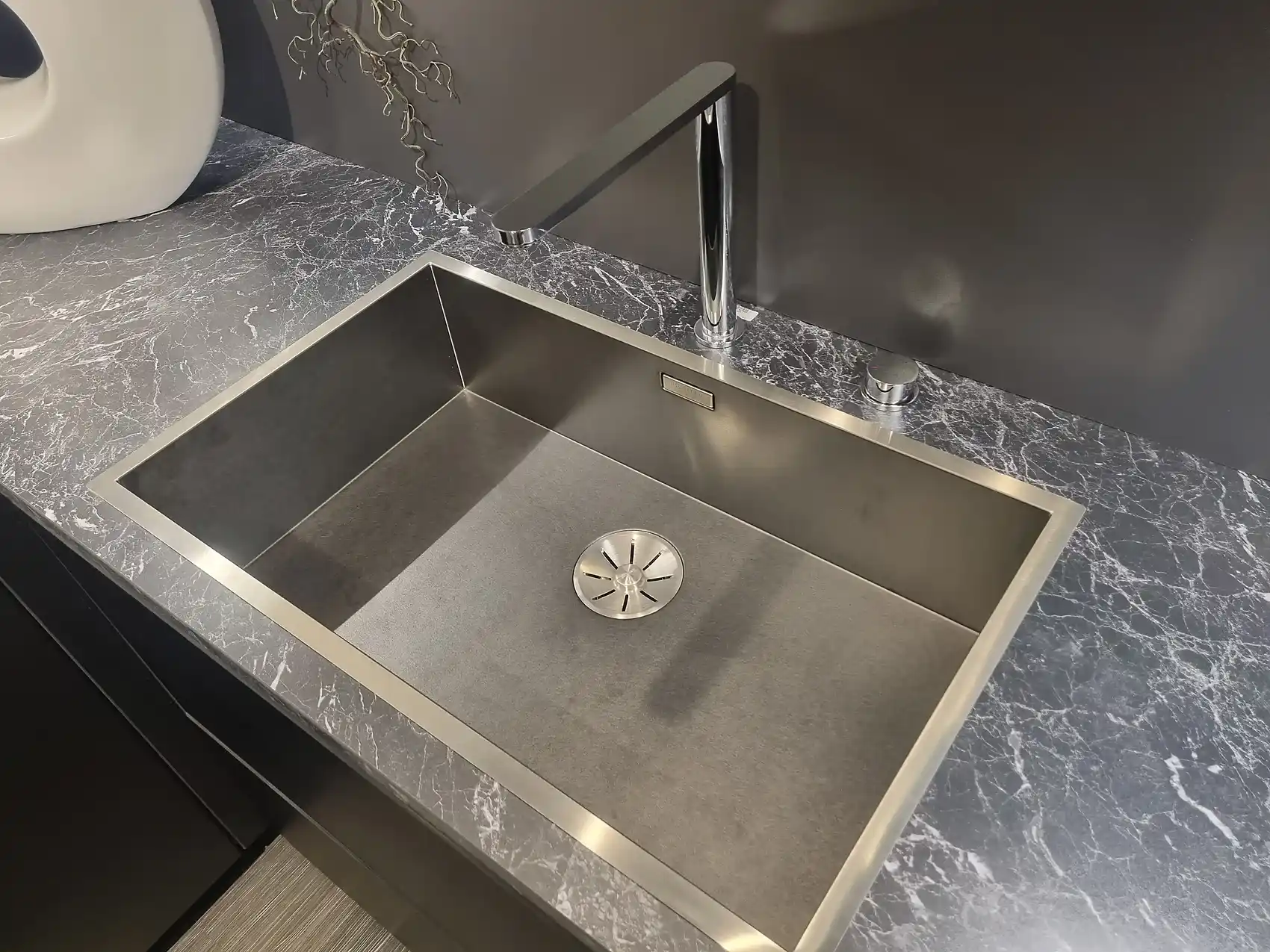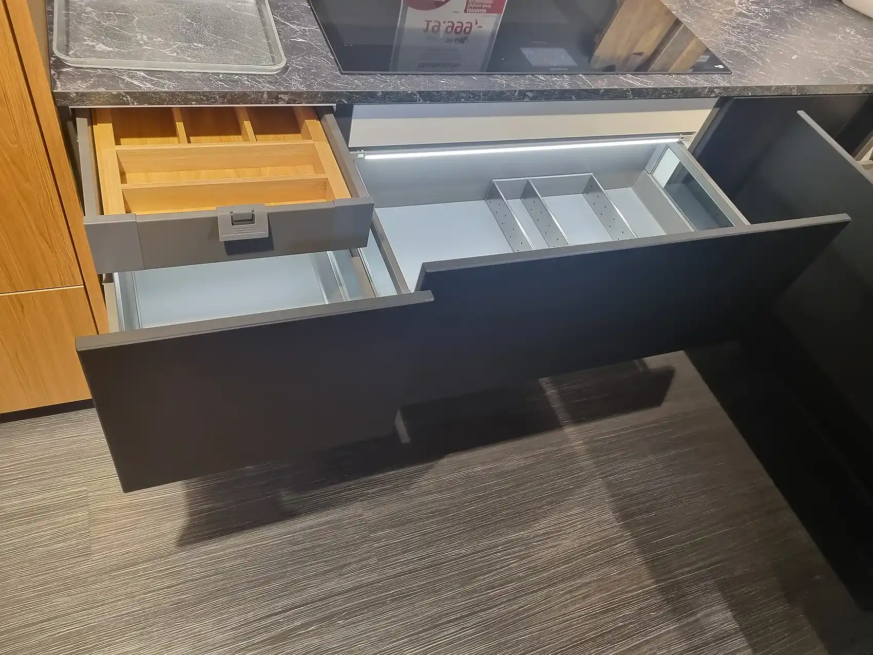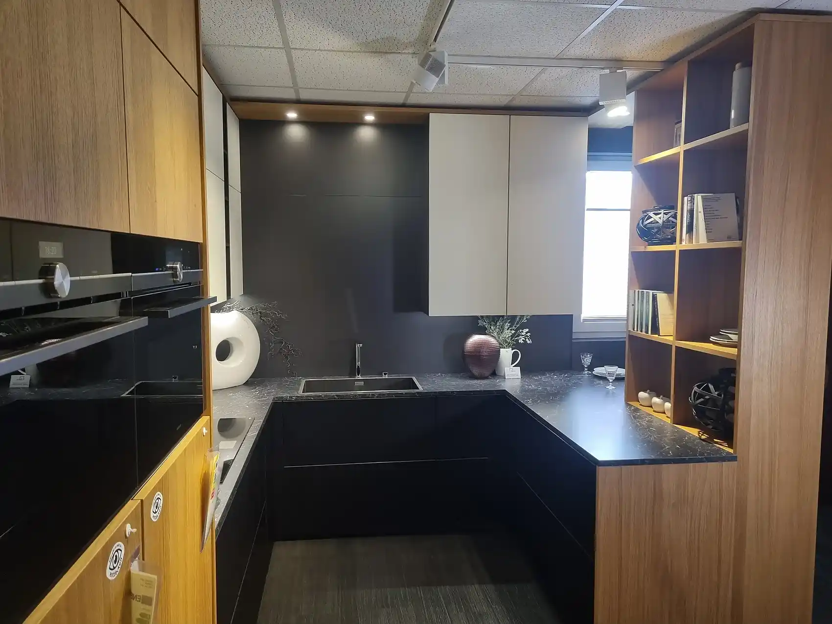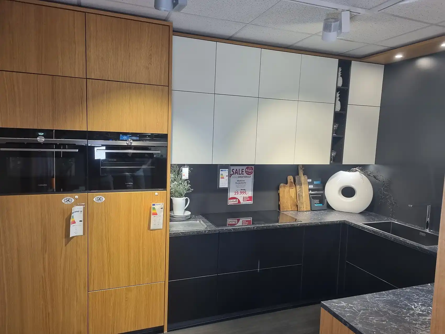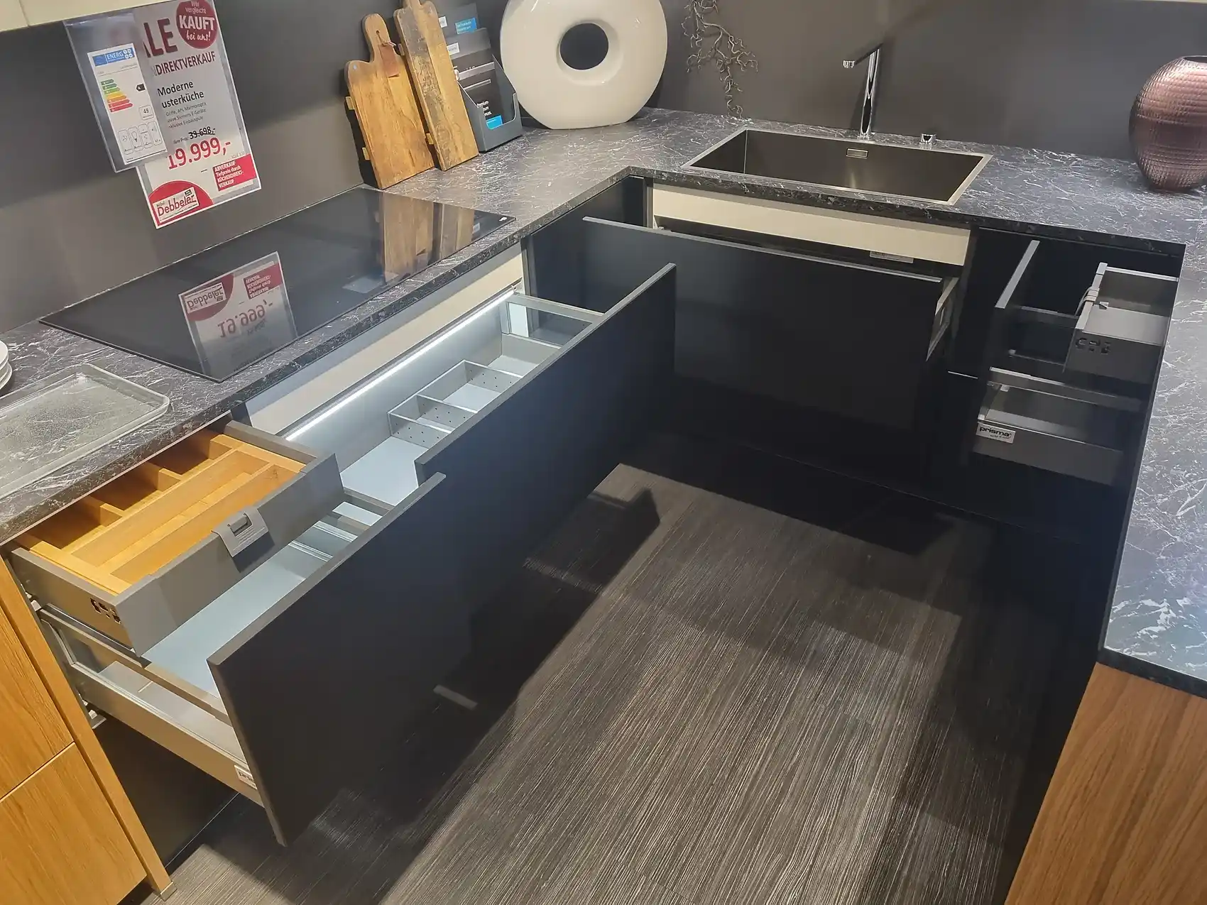 Entdecken Sie die Eleganz und Funktionalität unserer Einbauküche mit einem modernen Touch. Der Korpus in Carbon-Finish (117) verleiht der Küche eine zeitlose Ästhetik, während der grifflose Griff (997) ein nahtloses Erscheinungsbild schafft. Die Arbeitsplatte in Marmor Schwarz (868) setzt einen markanten Akzent und bietet eine robuste Arbeitsfläche für kulinarische Kreationen.