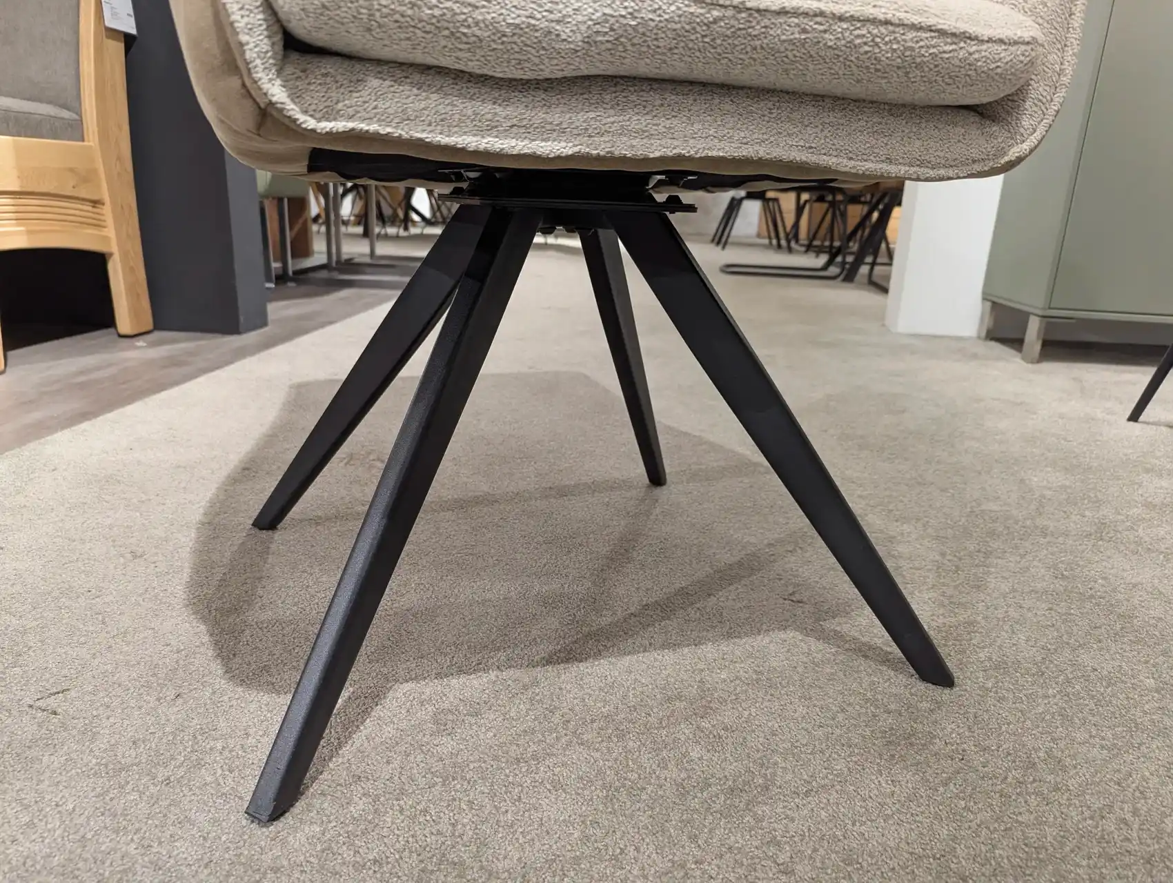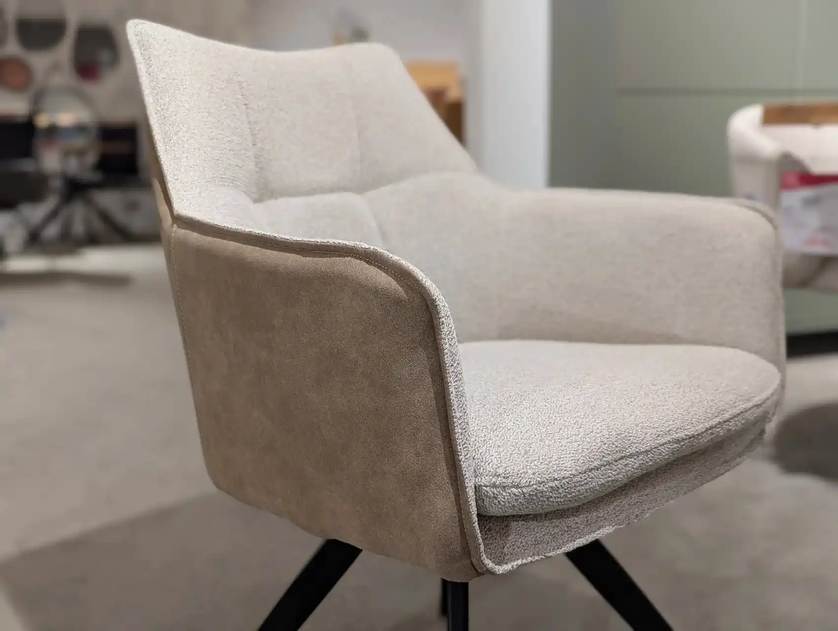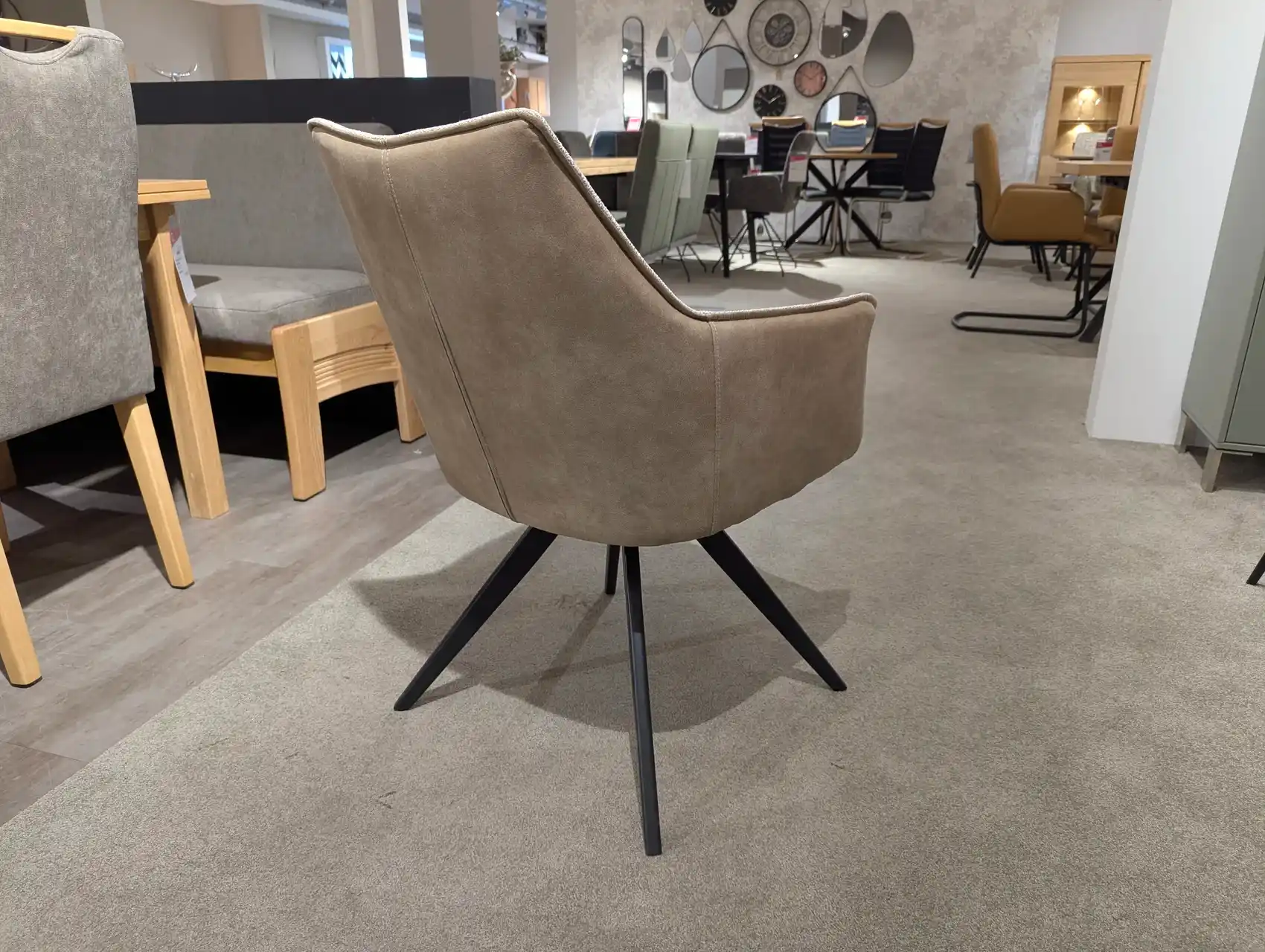 Moderner Armlehnenstuhl mit Sitzkissen und markanter Kreuzsteppung im Rücken. Die Bezugskombination „Sahara“ in Taupe verbindet außen robuste Microfaser mit einem angenehm strukturierten Webstoff im Innenbereich und sorgt für eine hochwertige, wohnliche Optik. Das Stativgestell aus Eisen in Schwarz bietet stabile Standfestigkeit und einen modernen Kontrast zum Bezug. Durch die 180° Drehfunktion mit Rückholmechanik kehrt der Stuhl automatisch in die Ausgangsposition zurück und sorgt so für Komfort im täglichen Gebrauch.
