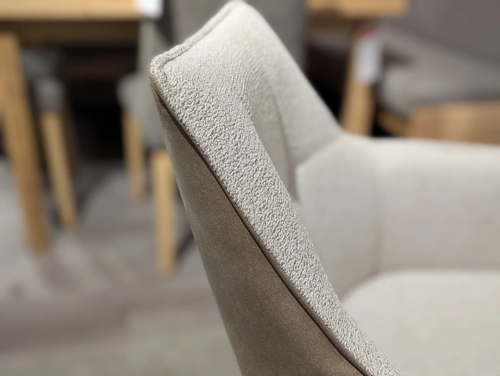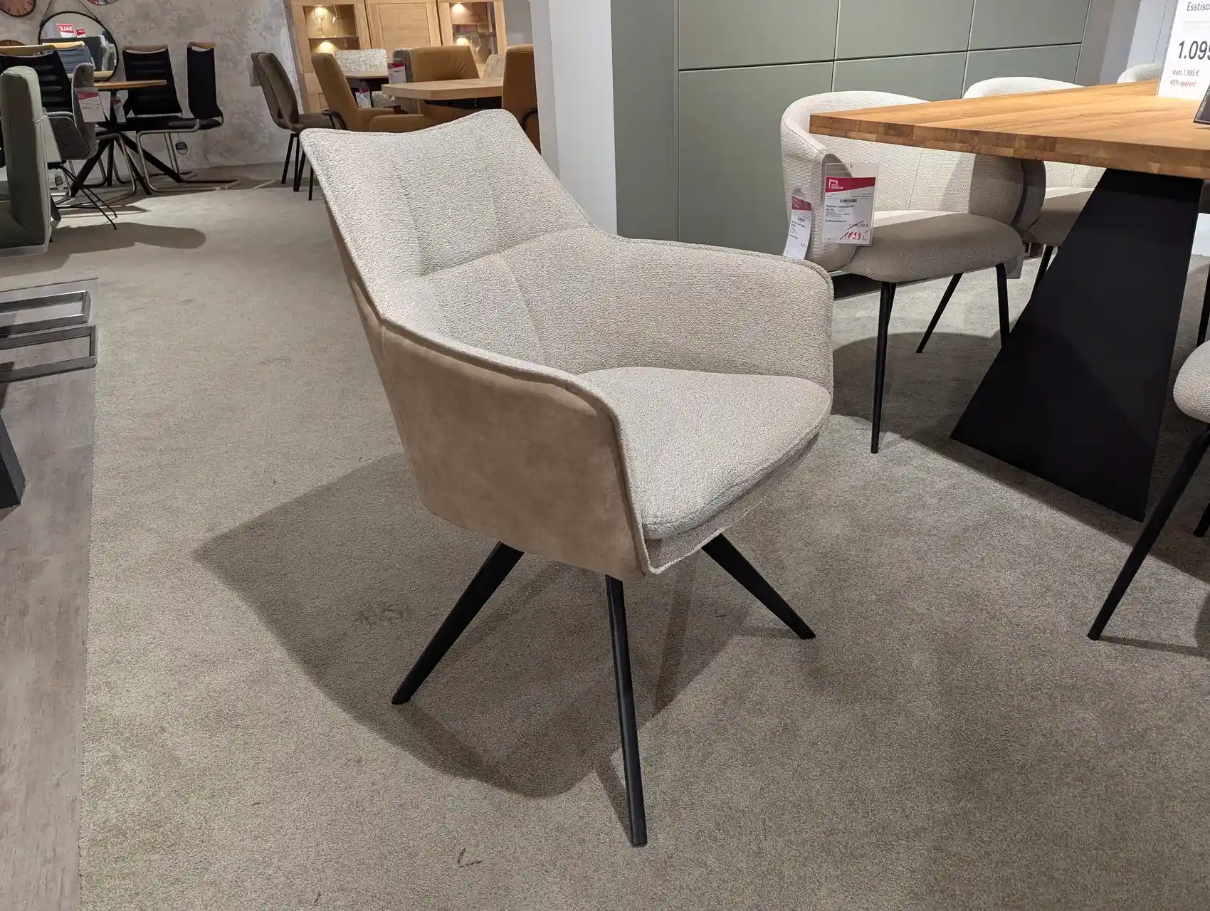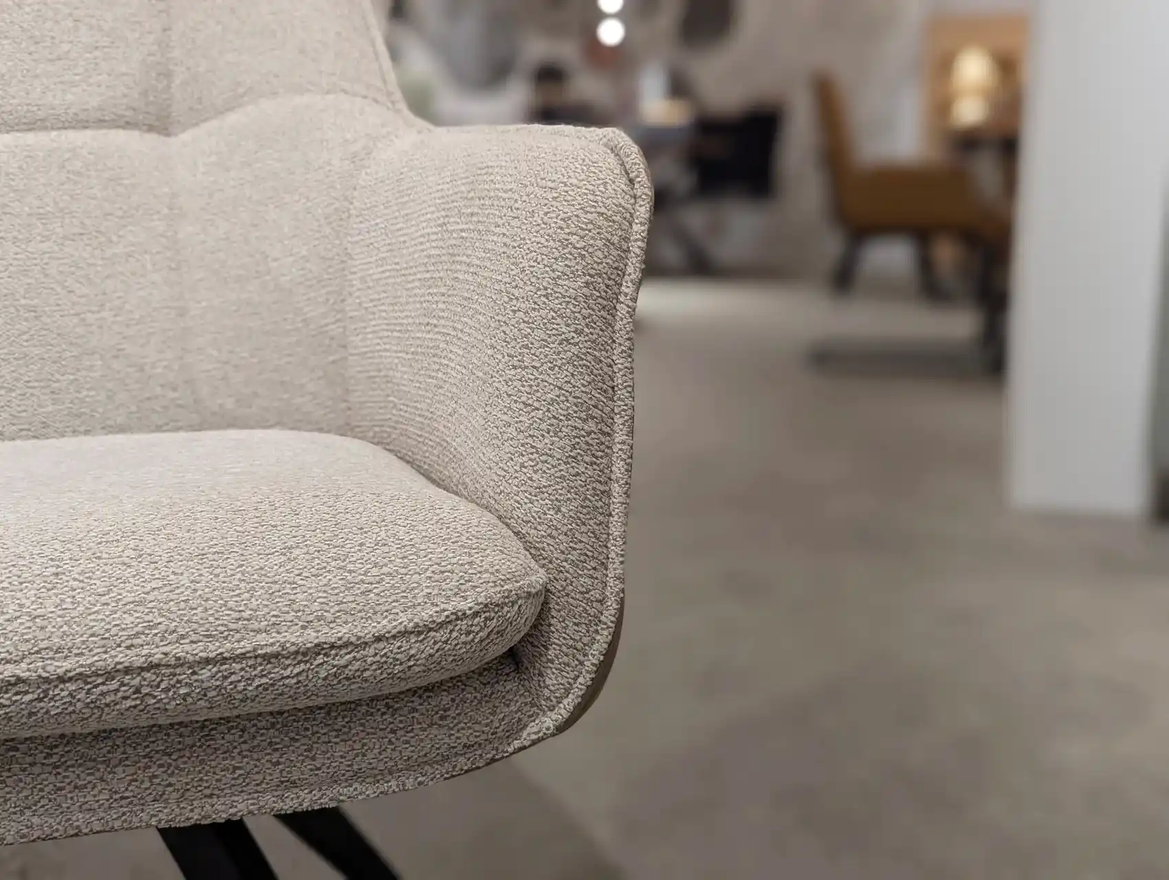 Moderner Armlehnenstuhl mit Sitzkissen und markanter Kreuzsteppung im Rücken. Die Bezugskombination „Sahara“ in Taupe verbindet außen robuste Microfaser mit einem angenehm strukturierten Webstoff im Innenbereich und sorgt für eine hochwertige, wohnliche Optik. Das Stativgestell aus Eisen in Schwarz bietet stabile Standfestigkeit und einen modernen Kontrast zum Bezug. Durch die 180° Drehfunktion mit Rückholmechanik kehrt der Stuhl automatisch in die Ausgangsposition zurück und sorgt so für Komfort im täglichen Gebrauch.