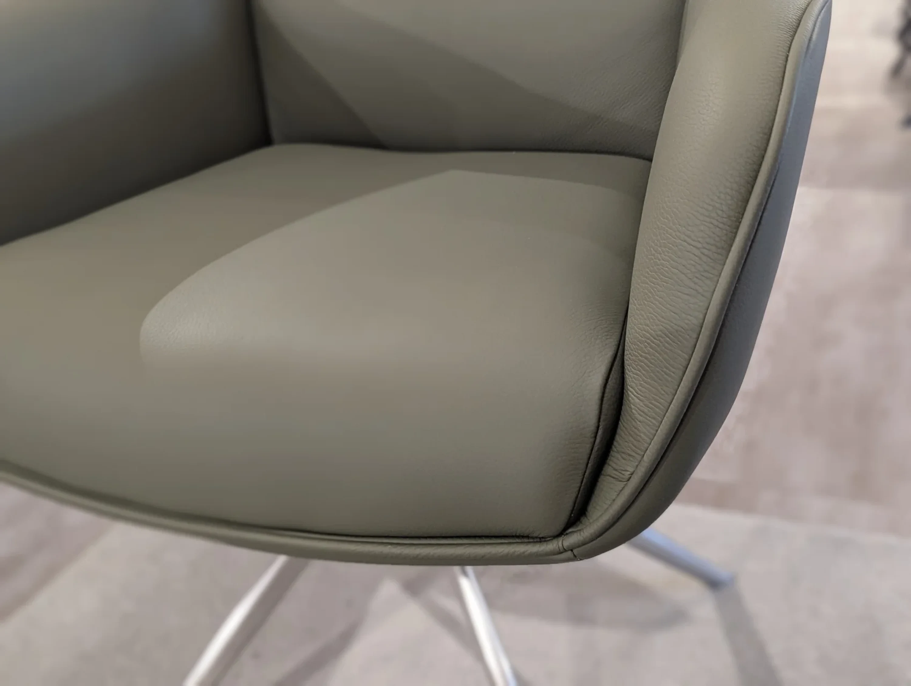 Der 4-Fuß-Armlehnstuhl kombiniert Komfort und modernes Design. Der Bezug aus Leder in Olive sorgt für eine edle Optik, während der Taschenfederkern im Sitz für besonders angenehmen Sitzkomfort sorgt. Das oval-konische Gestell aus gebürstetem Edelstahl bietet Stabilität und harmoniert elegant mit dem Lederbezug. Dank der 360-Grad-Drehfunktion lässt sich der Stuhl flexibel nutzen. Mit einer maximalen Belastbarkeit von 120 kg ist er ideal für Esszimmer, Wohnbereiche oder Büros geeignet. Hochwertige Materialien und durchdachte Konstruktion machen diesen Stuhl zu einem langlebigen und komfortablen Möbelstück.
