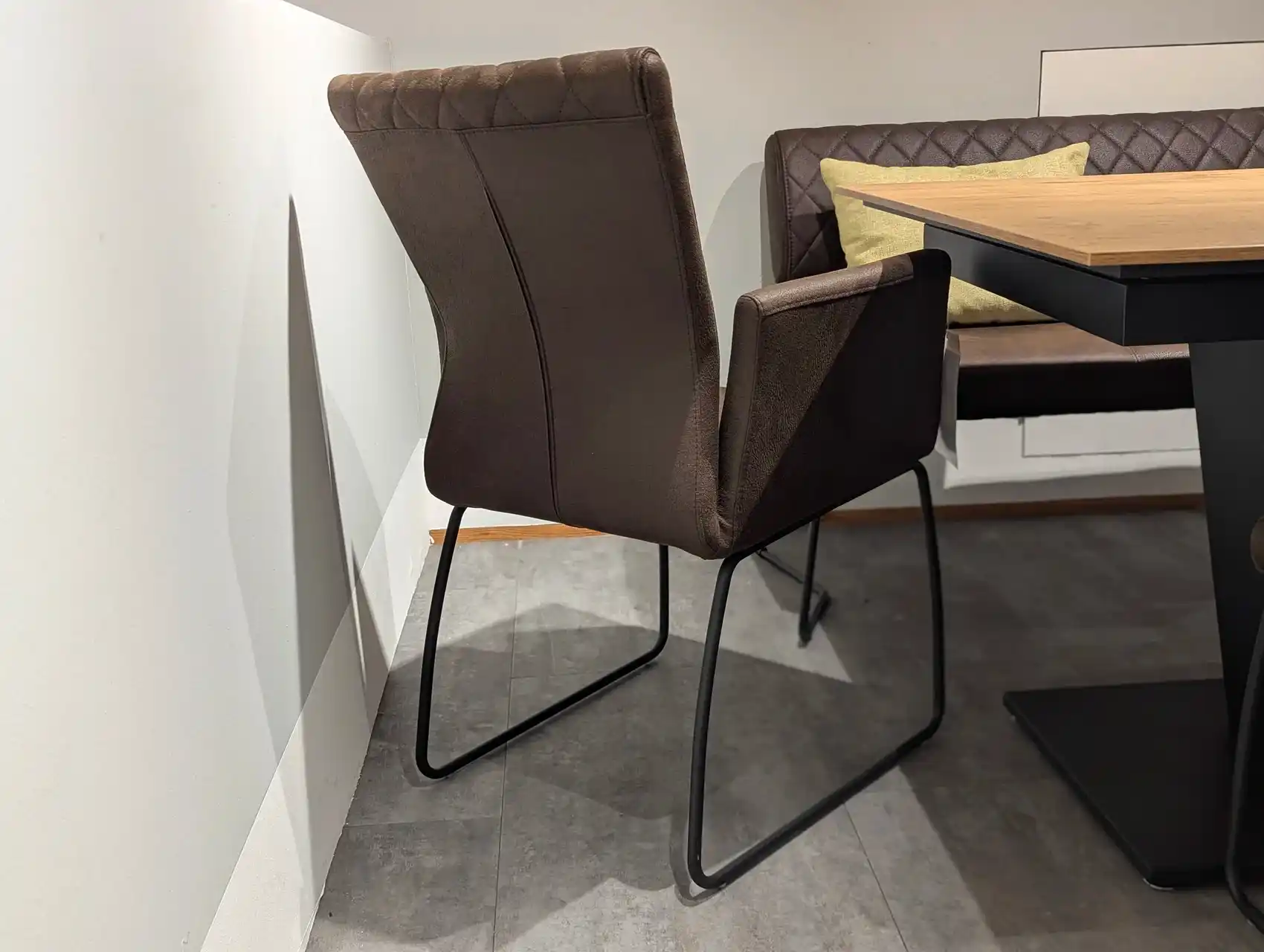 Der Armlehnstuhl kombiniert wohnliche Gemütlichkeit mit modernem Design. Die Sitzschale mit integrierten Armlehnen ist mit einer pflegeleichten Mikrofaser in Braun bezogen und sorgt für hohen Sitzkomfort. Das Kufengestell in Schwarz unterstreicht die zeitgemäße Optik und bietet zugleich Stabilität.