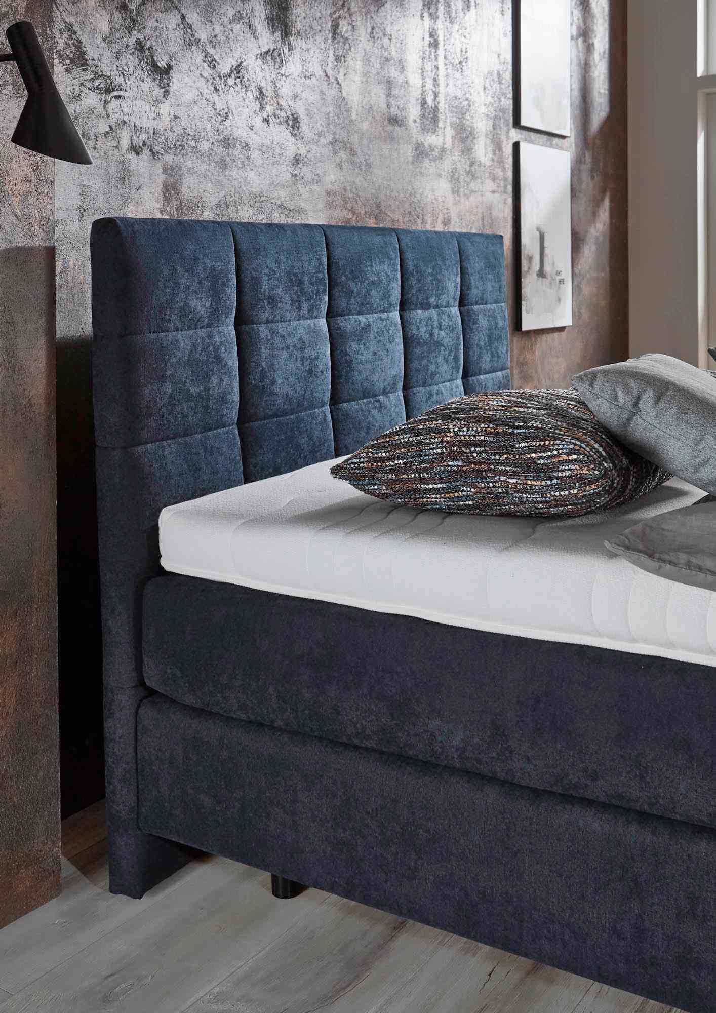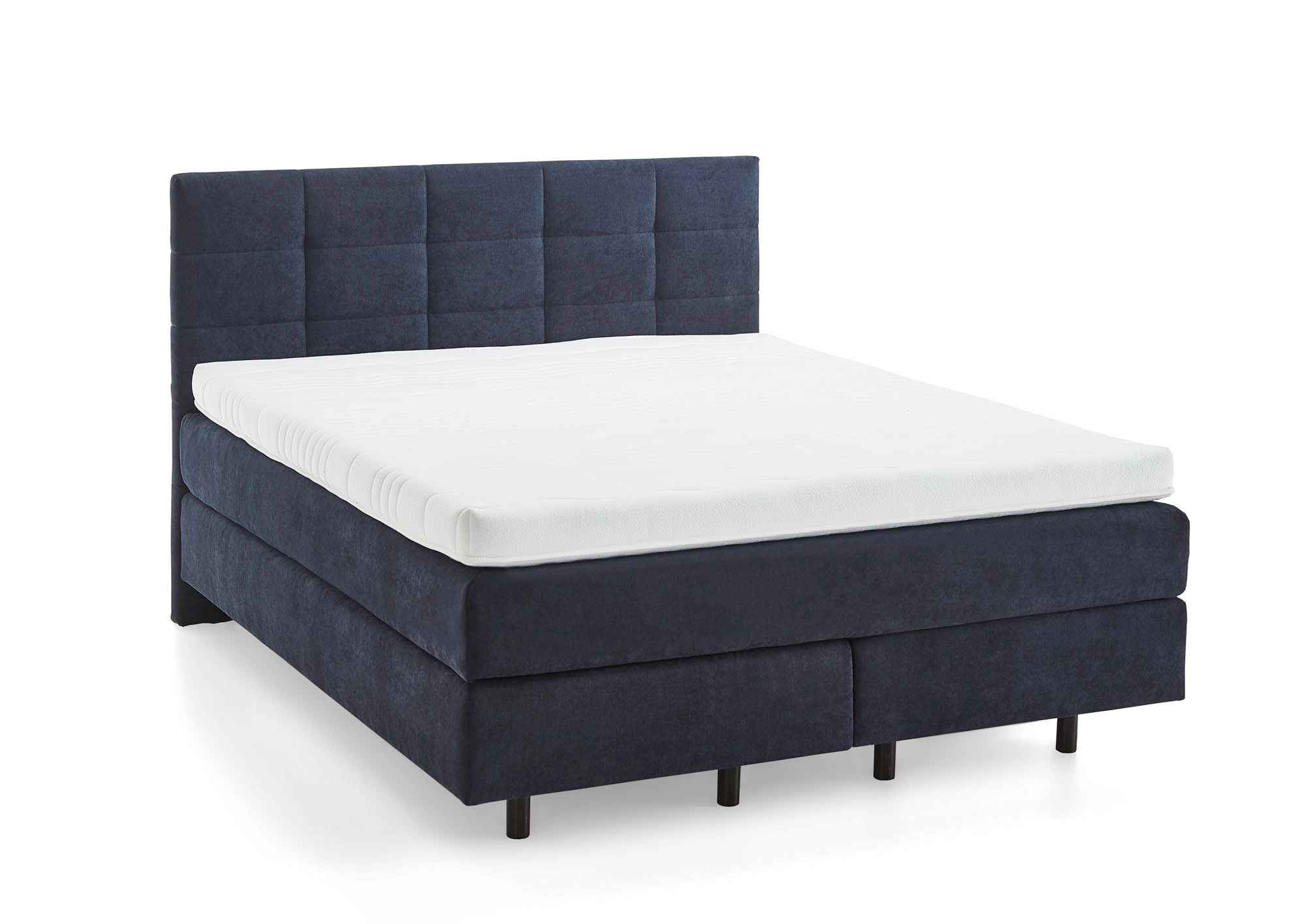 Komfortables Boxspringbett mit Bezug in Stoff Enjoy (PG2) in der Farbe Marine. Die elegante Schwebeoptik mit 15 cm hohen Füßen (K08-15) verleiht dem Bett eine moderne, leichte Ausstrahlung.