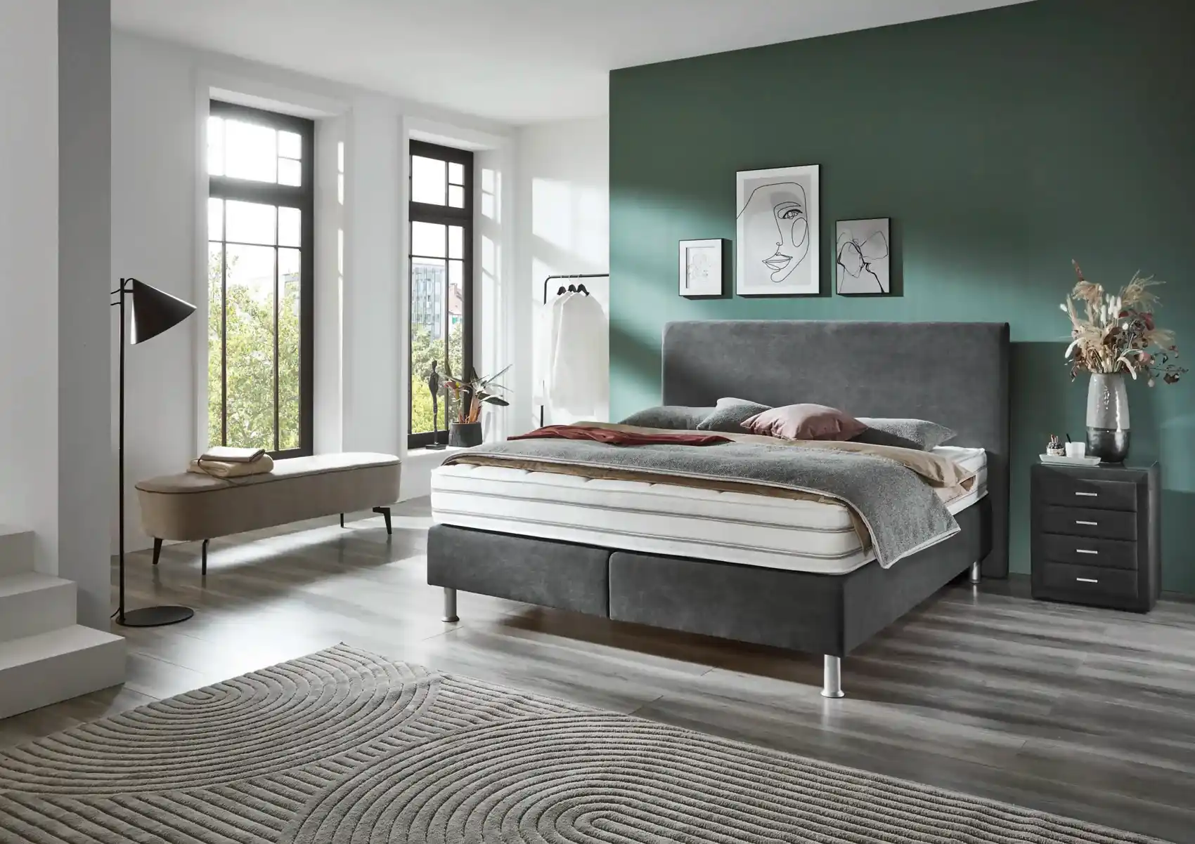 Entdecken Sie himmlischen Schlafkomfort mit unserem Boxspringbett in elegantem Anthrazit. Mit einer großzügigen Liegefläche von 180x200 cm bietet dieses Bett ausreichend Platz für erholsame Nächte. Die alufarbenen Kunststofffüße verleihen dem Bett eine moderne Note und sorgen gleichzeitig für Stabilität. Genießen Sie Luxus und Entspannung in Ihrem Schlafzimmer mit diesem stilvollen und komfortablen Boxspringbett.