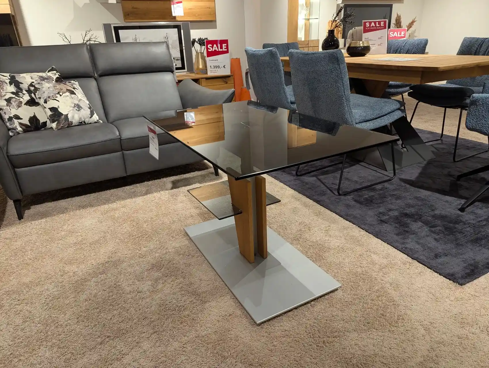 Dank der Hydrolift-Höhenverstellung lässt sich die Tischhöhe flexibel von 47 bis 65 cm anpassen – ideal zum für entspannte Abende auf dem Sofa. Die Liftmechanik in Perlsilber harmoniert elegant mit der edlen Parsolglasplatte und unterstreicht das moderne Design.