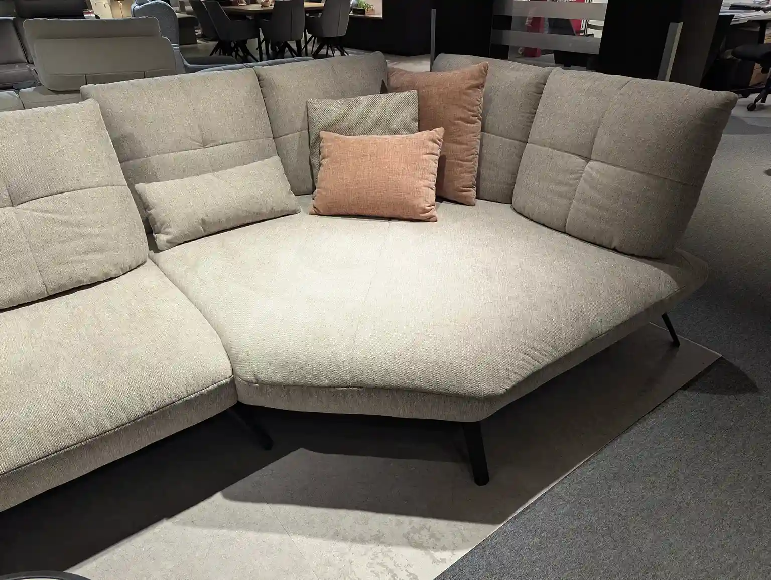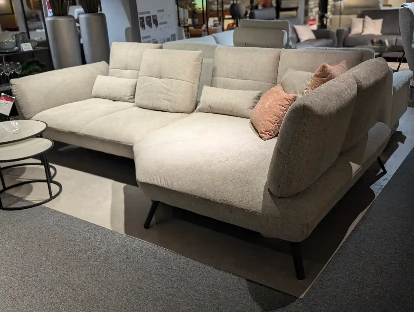 Dieses moderne Ecksofa besticht durch seinen natürlichen Bezugsstoff in Brego nature 31 und eine klar strukturierte, zeitgemäße Formgebung. Der hochwertige Pur-Schaum-Sitzkomfort in Kombination mit einer Sitzhöhe von 43 cm bietet eine angenehme Unterstützung und lädt zum entspannten Verweilen ein.