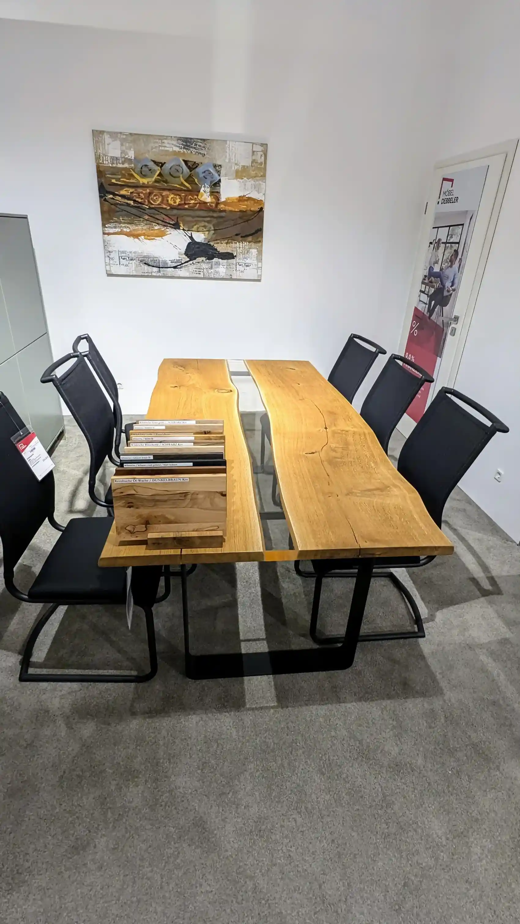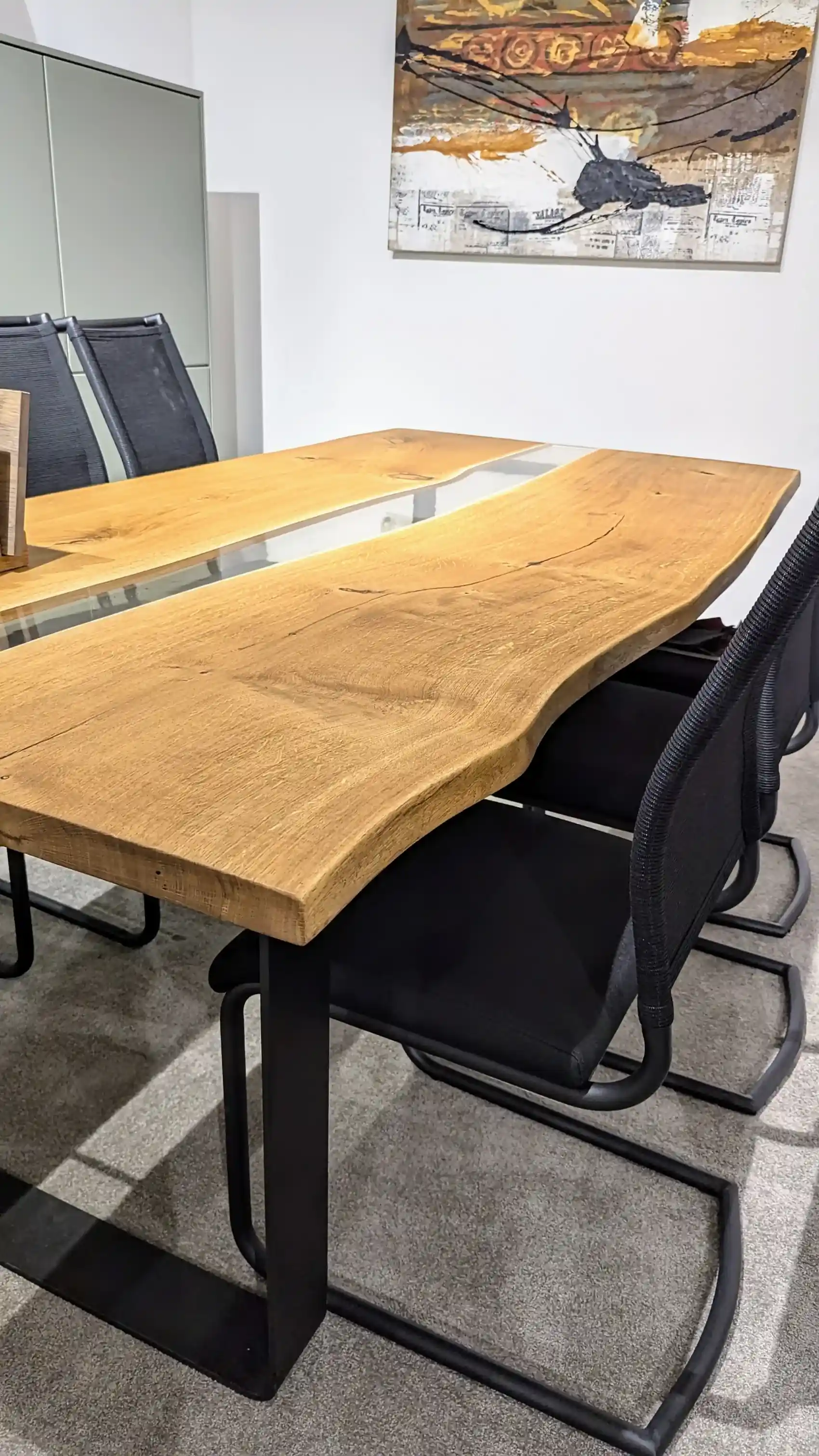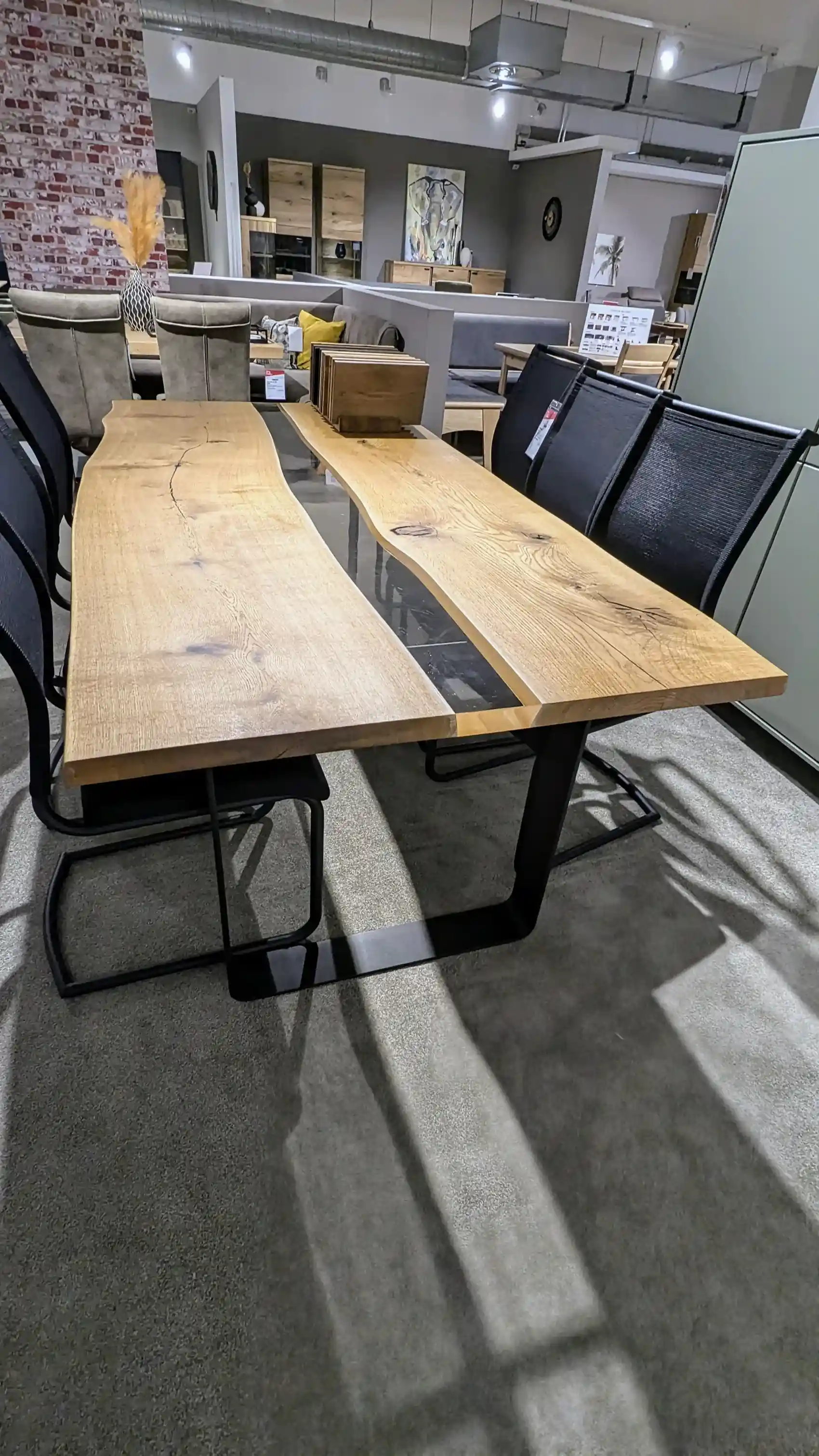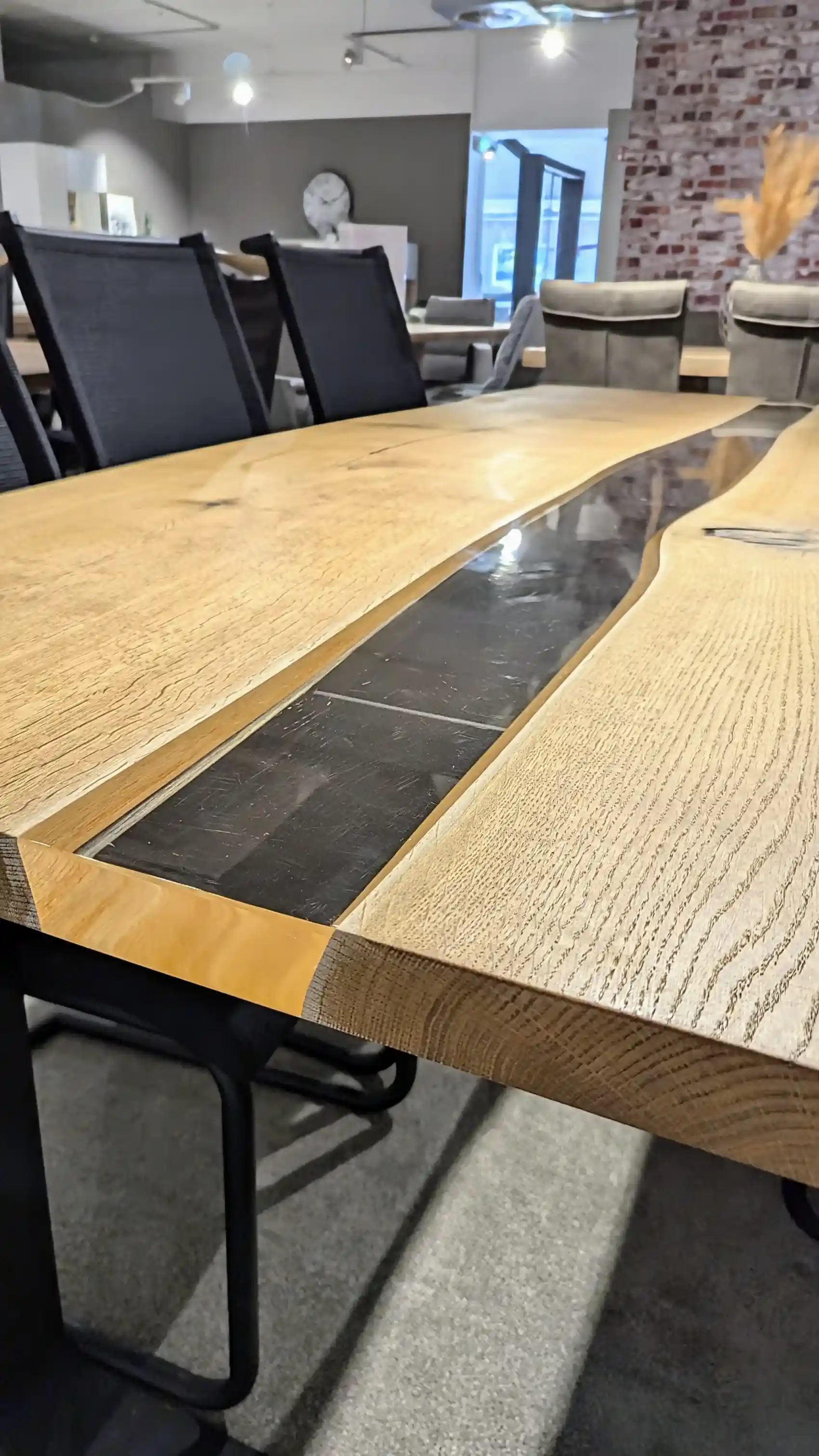 Unser Esstisch kombiniert modernes Design mit natürlichem Charme. Mit den Maßen 200 x 100 x 76 cm bietet dieser Tisch großzügigen Platz für Ihre Mahlzeiten. Die U-Kufen aus schwarz matt pulverbeschichtetem Stahl sorgen für eine stabile und stilvolle Basis. Die Tischplatte aus geöltem Oiled Oak zeigt offene Äste und Wuchsrisse, die mit klarem Epoxidharz versiegelt sind, was dem Tisch einen einzigartigen Charakter verleiht. Perfekt für zeitgenössische und rustikale Einrichtungsstile.