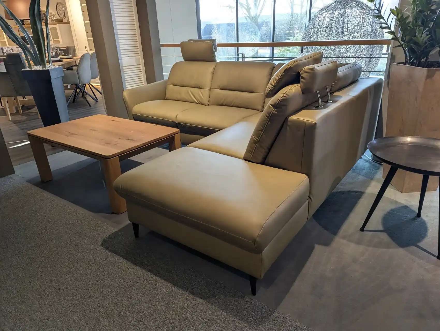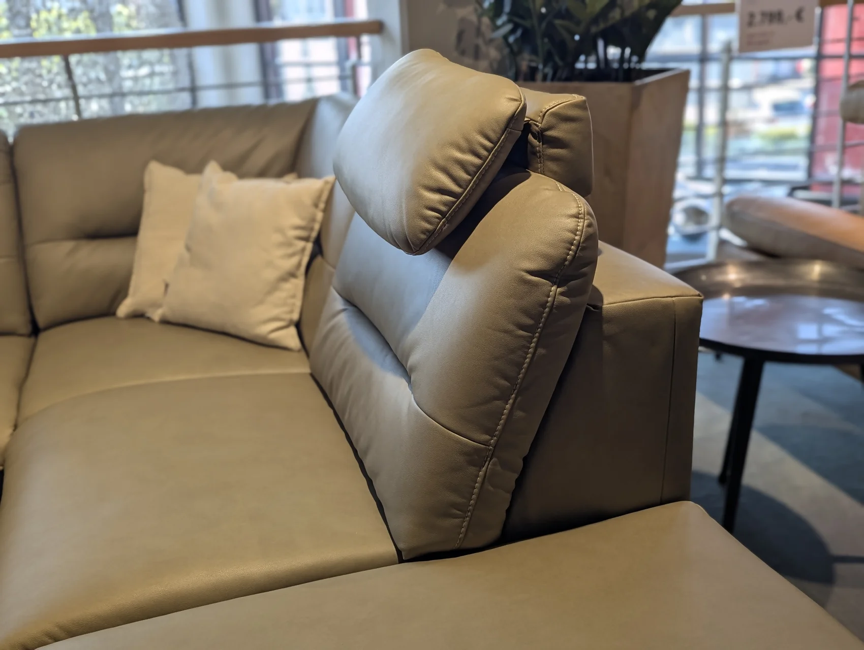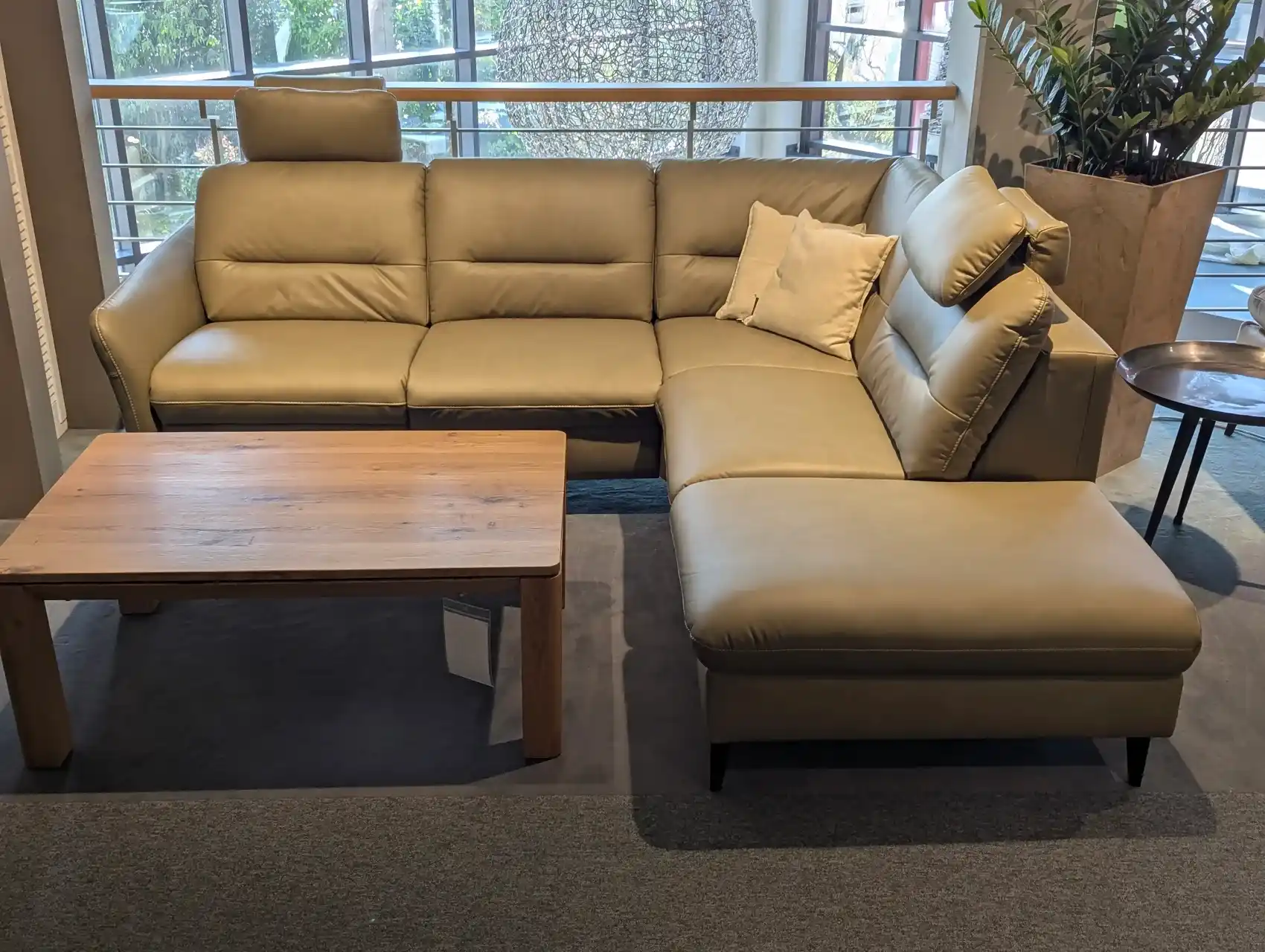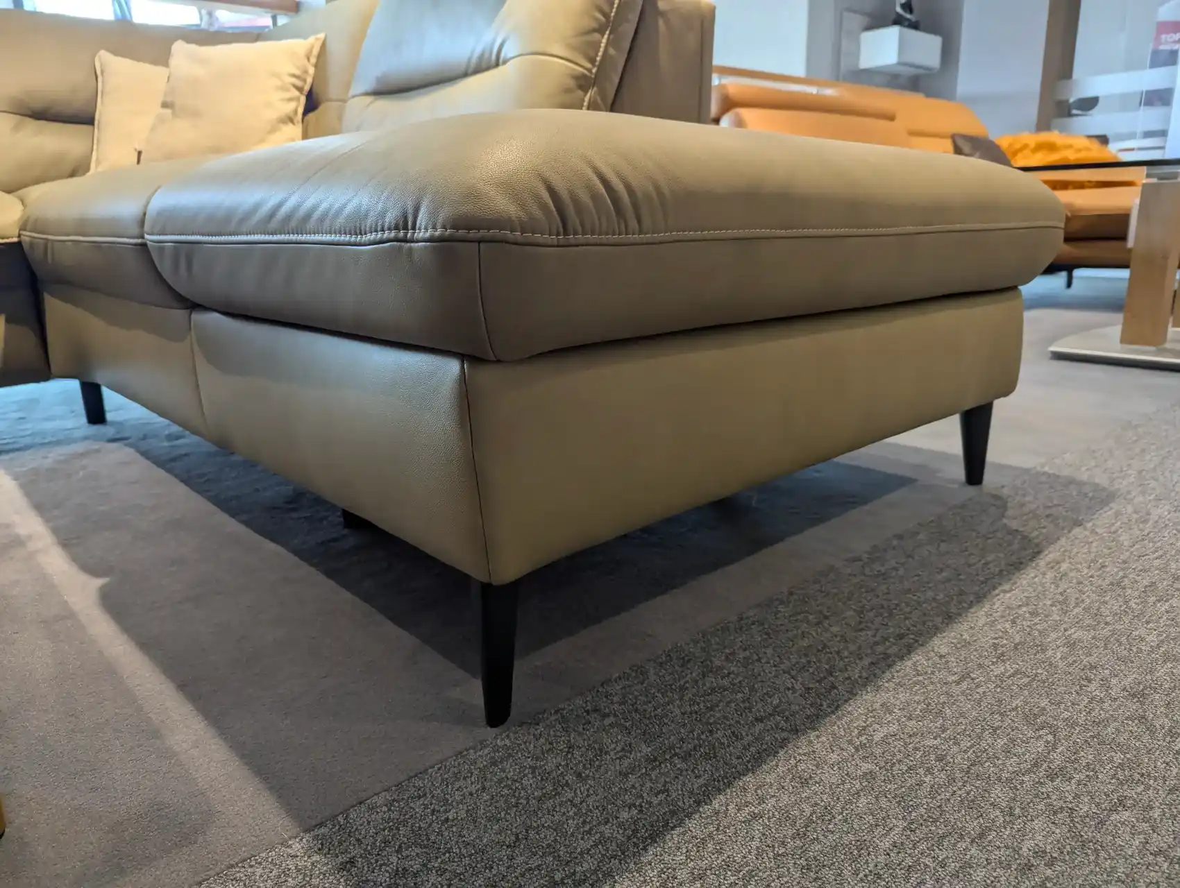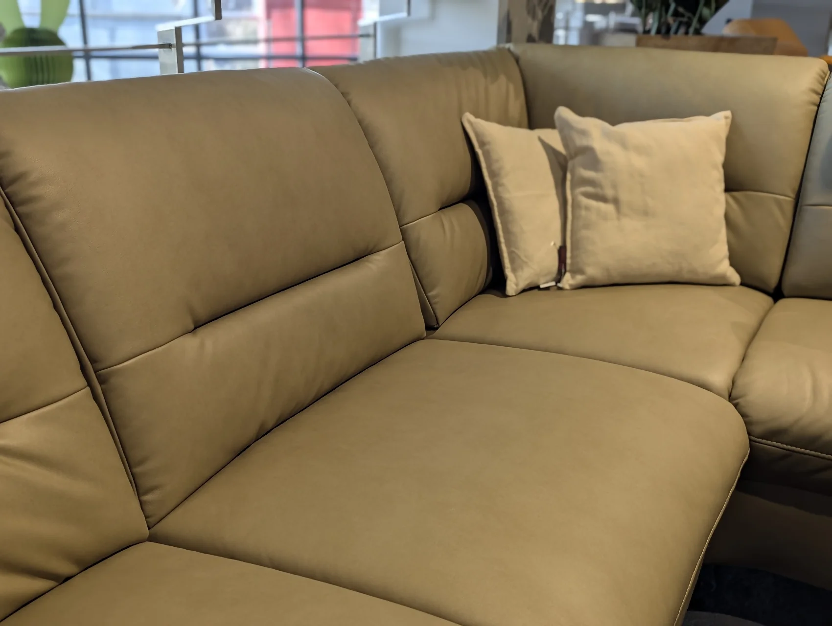 Modernes Ecksofa mit Bezug Galant Moos (E) und dekorativen Details wie Kontrastfaden und Kappnaht. Der Sitz mit Federkern bietet angenehmen Komfort, die Sitzhöhe beträgt ca. 48 cm. Der Rücken ist echt bezogen, was eine ansprechende Optik auch bei freier Aufstellung ermöglicht.