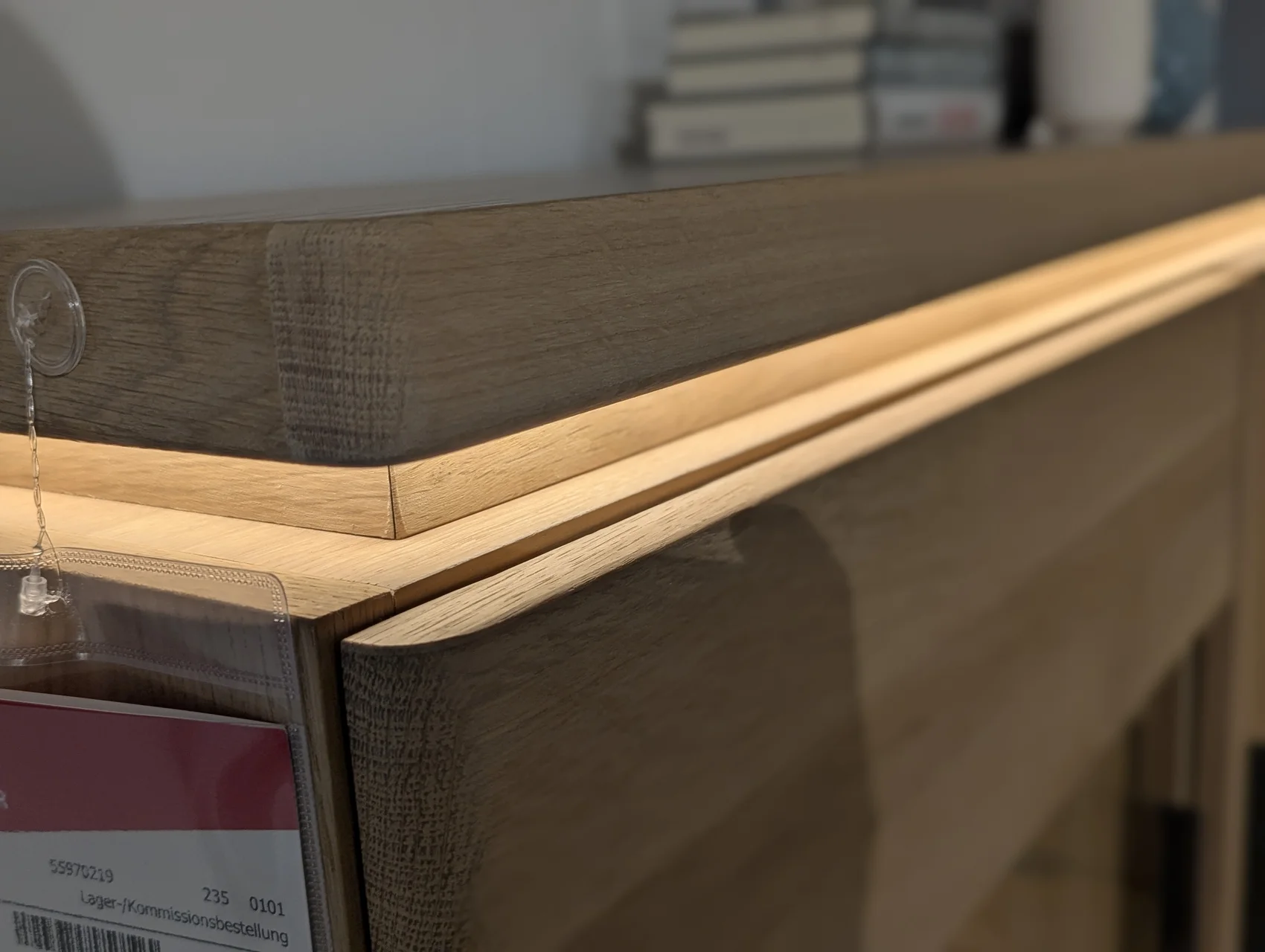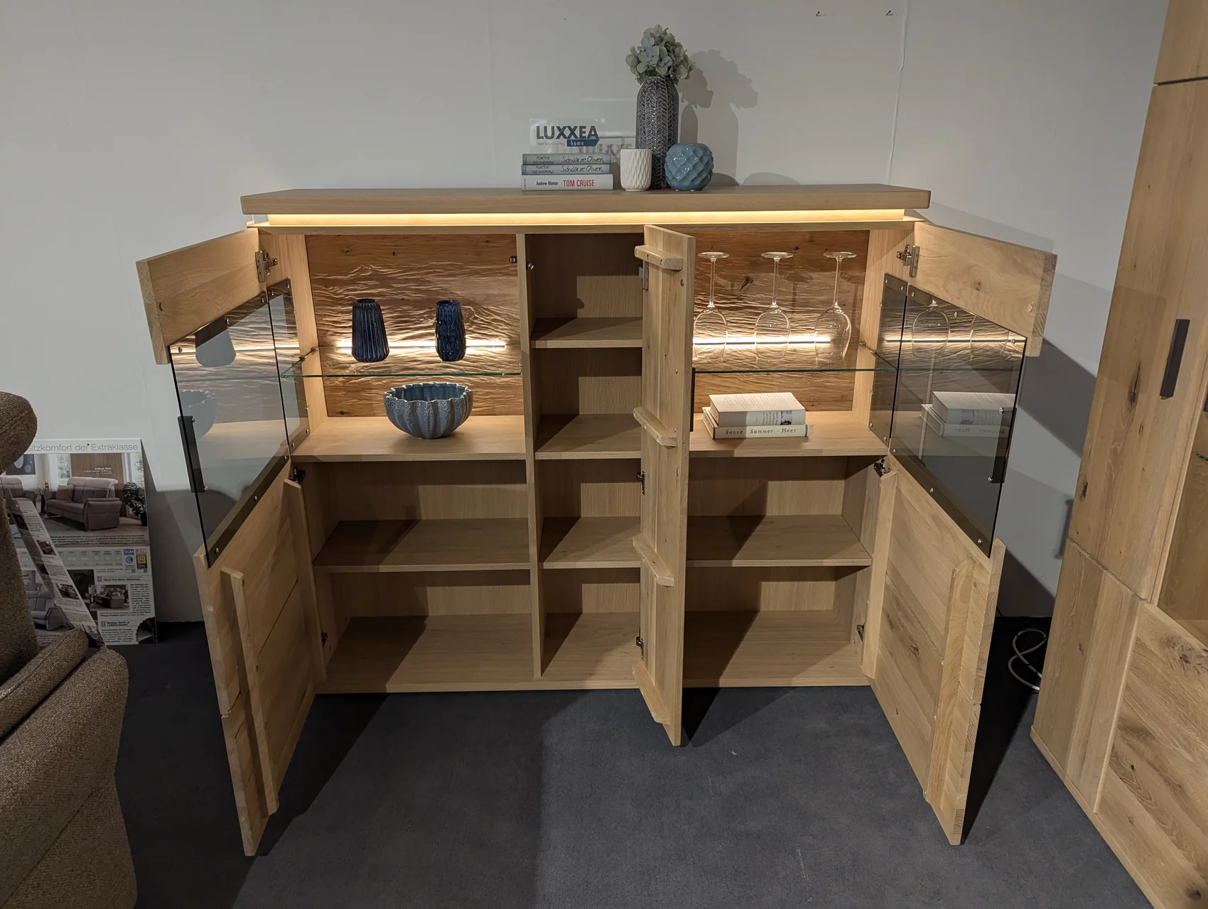 Das Highboard aus Balkeneiche Bianco überzeugt durch seine natürliche Holzoptik und eine geölte Oberfläche, die die Maserung besonders schön zur Geltung bringt. Die integrierte LED-Beleuchtung setzt gezielte Akzente und sorgt für eine angenehme Wohnatmosphäre. Dank der kompakten Bauweise bietet das Highboard vielseitigen Stauraum und eignet sich ideal für Wohn- und Essbereiche.