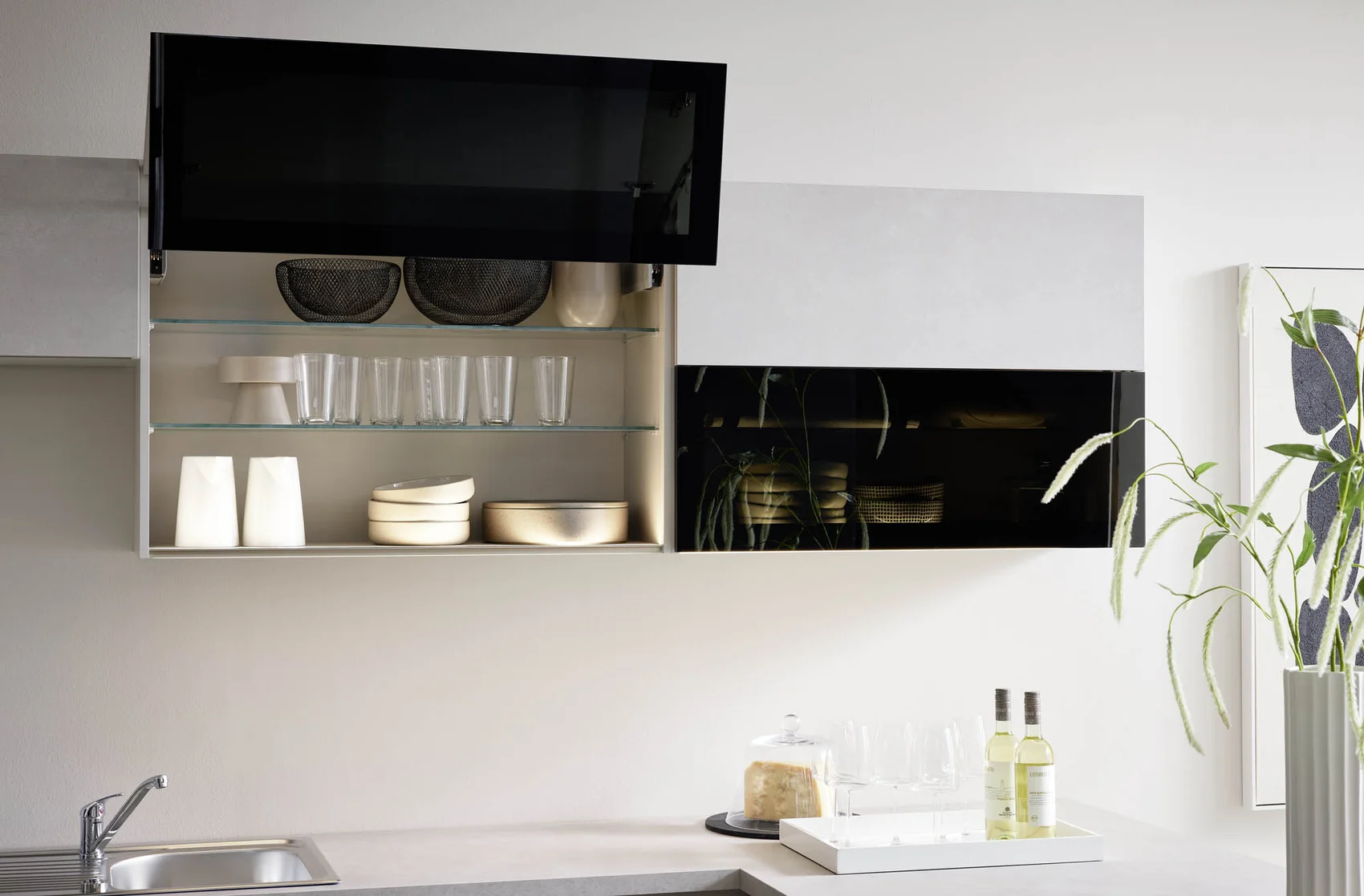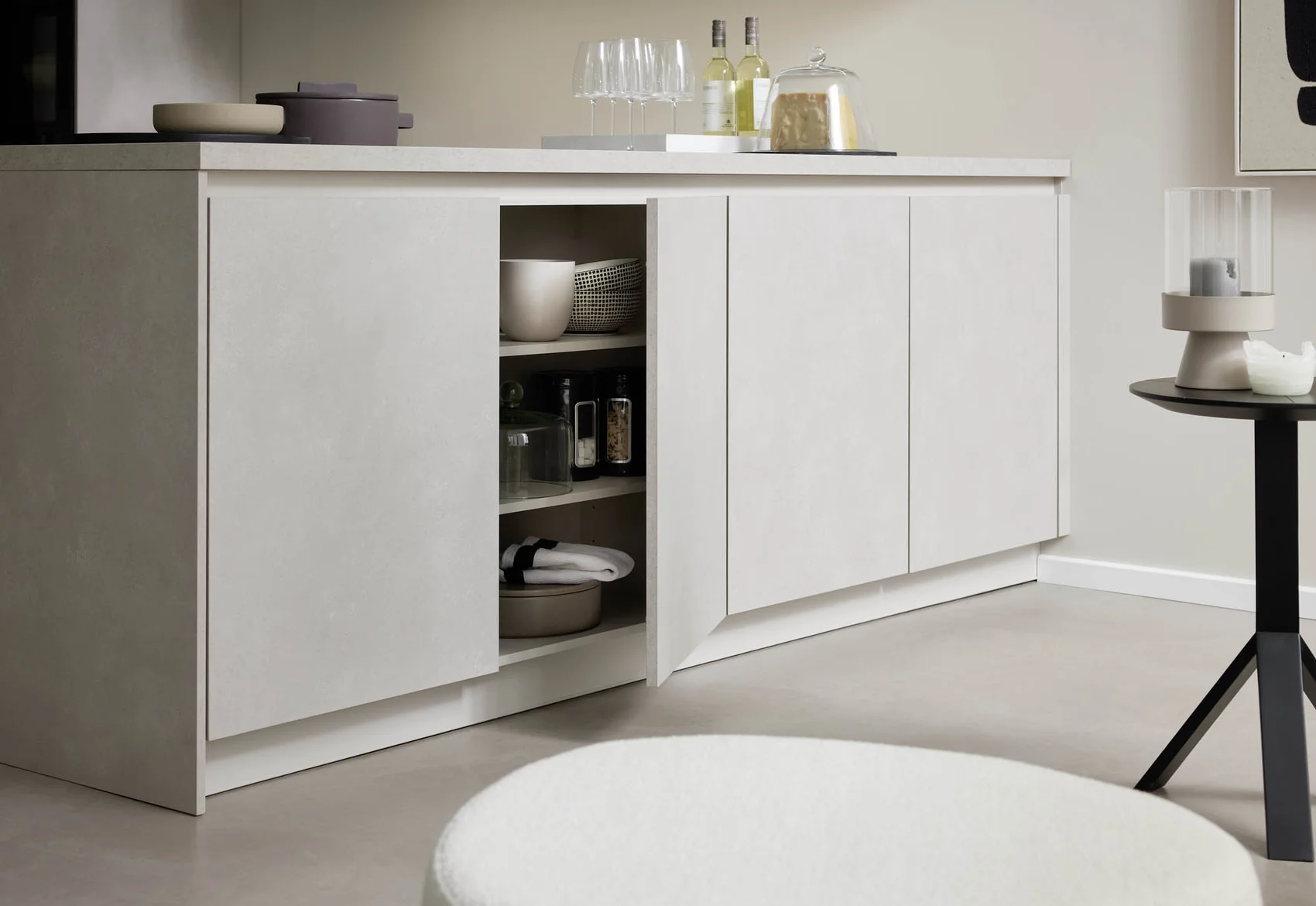Diese moderne Küche überzeugt durch eine besonders harmonische Ton-in-Ton-Gestaltung in warmen Sand- und Beige-Nuancen. Die Fronten in Sand und Sandbeige verleihen der Küche eine ruhige, zeitlose Ausstrahlung, während die Arbeitsplatte in Sand das Gesamtbild nahtlos ergänzt. Die pulverbeschichteten Griffe in Sandbeige runden das Design stilvoll ab und sorgen für eine dezente, elegante Linienführung.