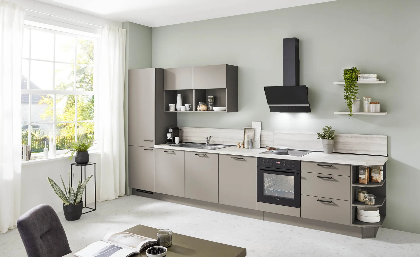 Diese Küche überzeugt mit einem harmonischen Farbkonzept in Taupegrau und einer stilvollen Arbeitsplatte in Travertin-Optik. Die matten Fronten der Serie Laser wirken modern und zurückhaltend, während schwarze Metallgriffe für klare Akzente sorgen. Nischenverkleidung und Arbeitsplatte greifen die Travertin-Struktur auf und sorgen für ein einheitliches, hochwertiges Gesamtbild.