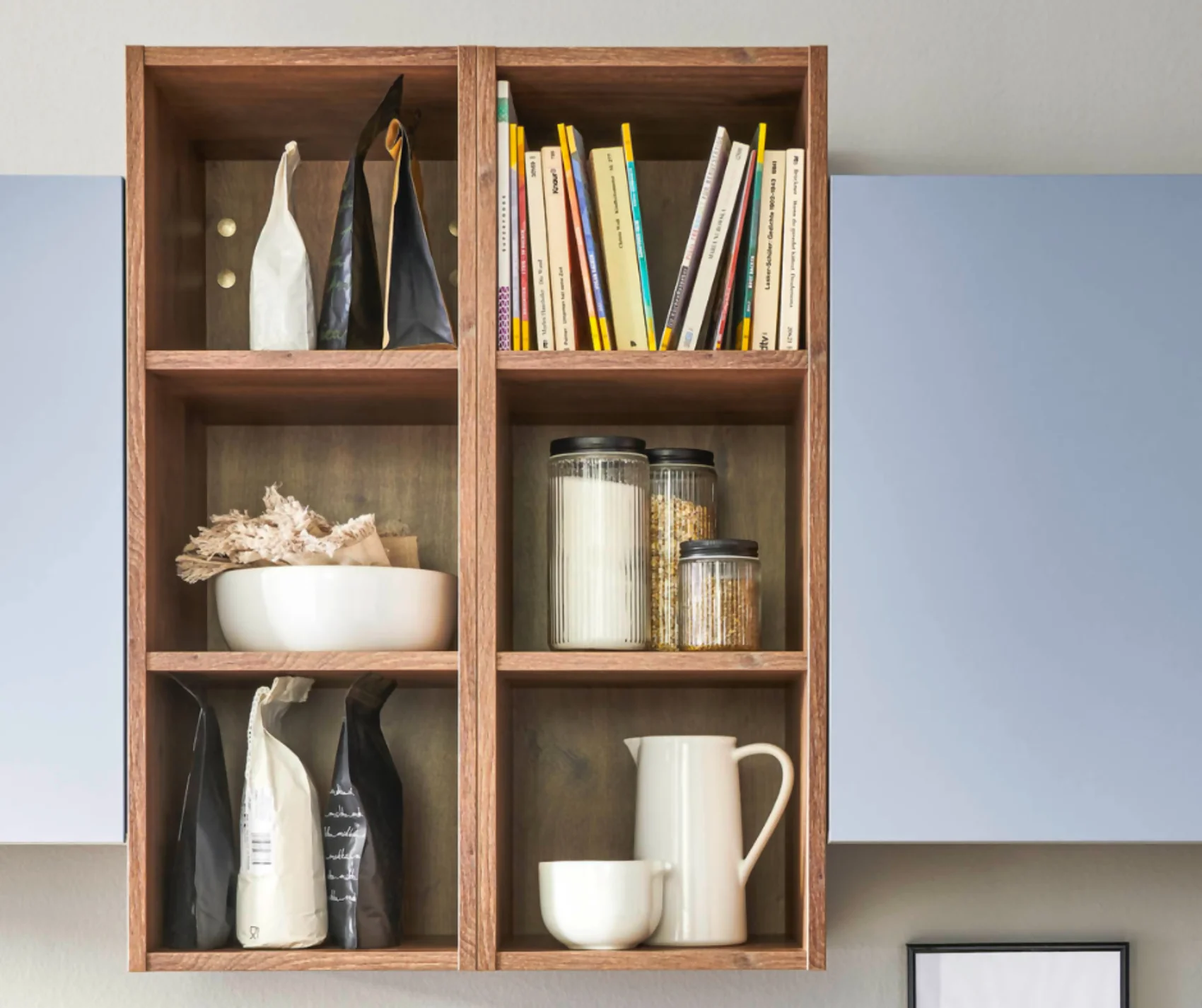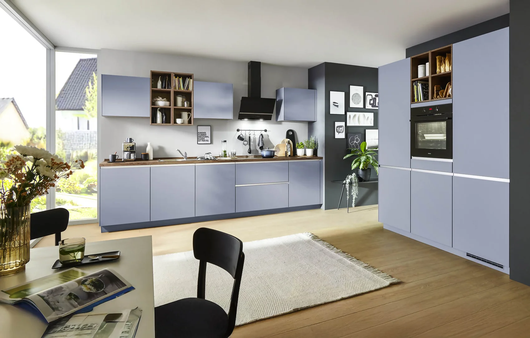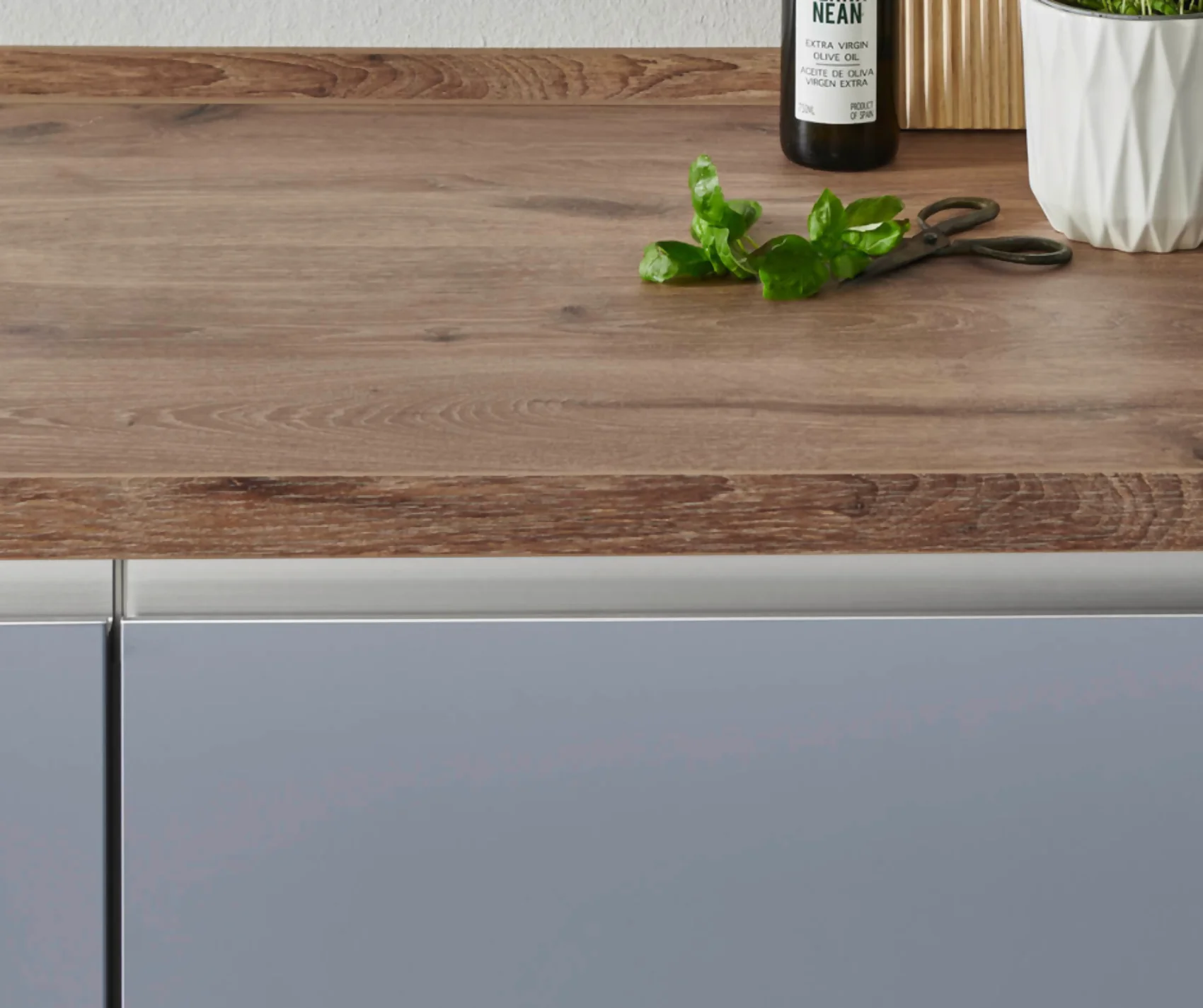 Diese Küche besticht durch ihre harmonische Farbkombination aus sanftem Skyblau und warmen Holztönen. Die matten Lackfronten sorgen für eine ruhige, moderne Optik, während die Vikings Oak Nachbildung der Arbeitsplatte für ein wohnliches Ambiente sorgt. Griffleisten in Edelstahloptik unterstreichen das geradlinige Design.