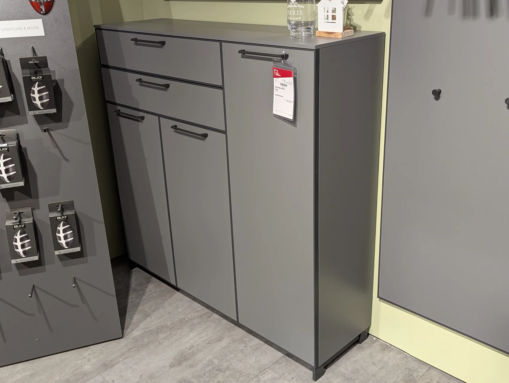 Diese elegante Garderoben-Kombination überzeugt mit einem modernen Design in Lack Grau und Anthrazit. Die Kommode (966-83) bietet praktischen Stauraum für Accessoires. Der Spiegel (986-90) in Anthrazit ergänzt das Ensemble perfekt und verleiht dem Eingangsbereich eine edle Note.