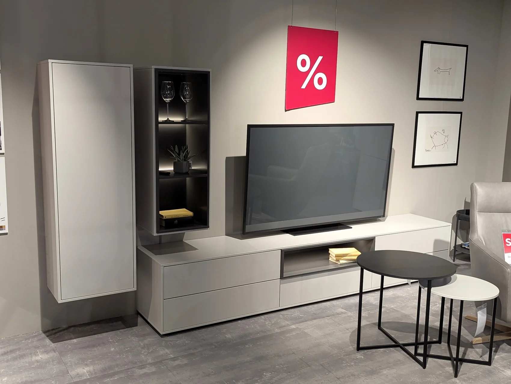 Diese moderne Wohnkombination in brillantgrauem Lack mit Klarglas bietet nicht nur ein stilvolles Design, sondern auch eine besonders hohe Funktionalität. Mit einem Push-to-Open-Griff und einem 16 mm Abdeckblatt im modernen Design passt diese Kombination perfekt in jedes moderne Zuhause.