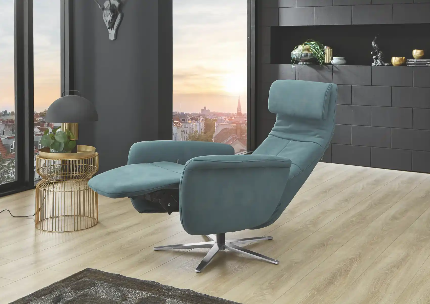 Moderner Relaxsessel mit Stoffbezug und echt bezogenem Rücken – ideal auch zur freien Platzierung im Raum. Das zeitlose Design wird durch einen eleganten Sternfuß aus Edelstahl stilvoll ergänzt.