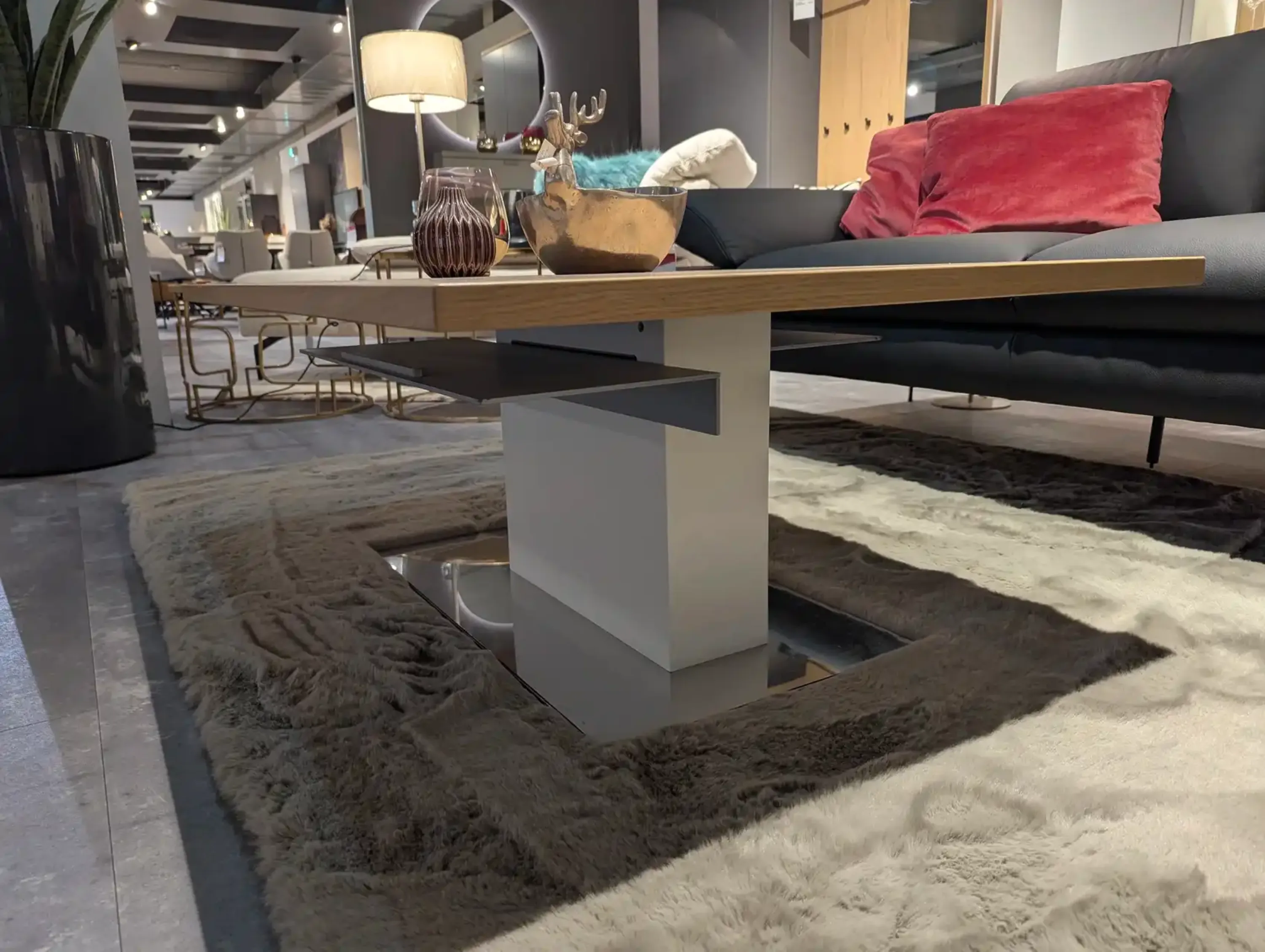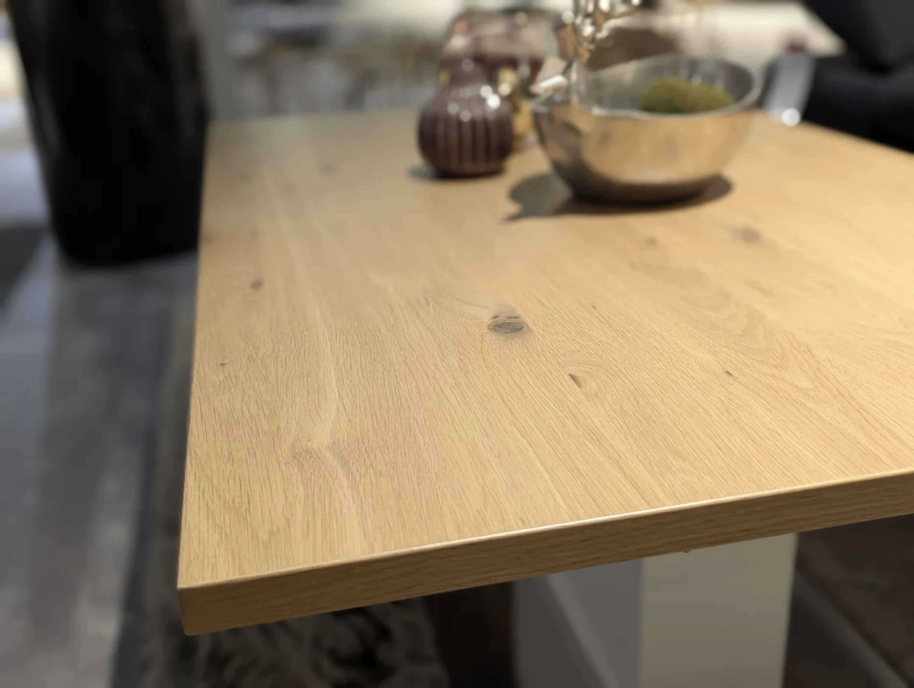 Der elegante Säulentisch vereint modernes Design mit natürlichen Holzakzenten. Der Korpus in Lack Weiß harmoniert stilvoll mit der Front aus Ast-Eiche, während die Fußplatte in Chrom dem Tisch Stabilität und einen modernen Akzent verleiht. Mit einer festen Platte und den Maßen 120 × 75 cm eignet sich der Tisch ideal für Essbereiche, Küchen oder als stilvoller Stehtisch in modernen Wohnräumen.
