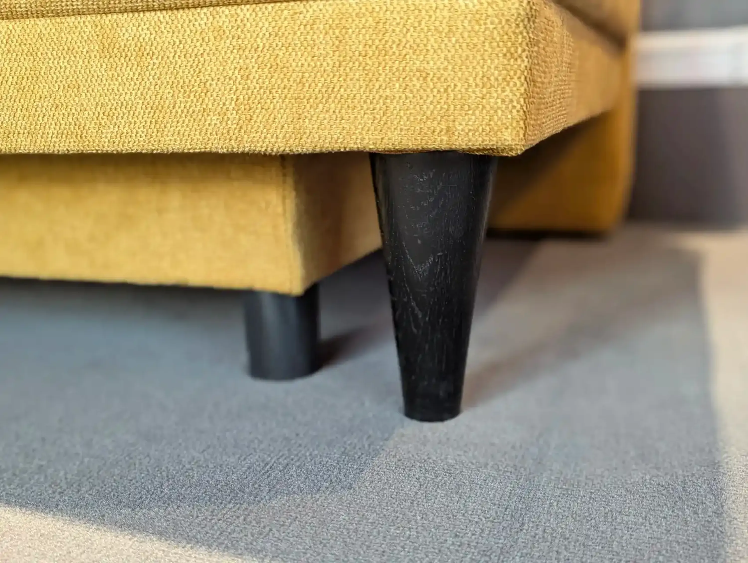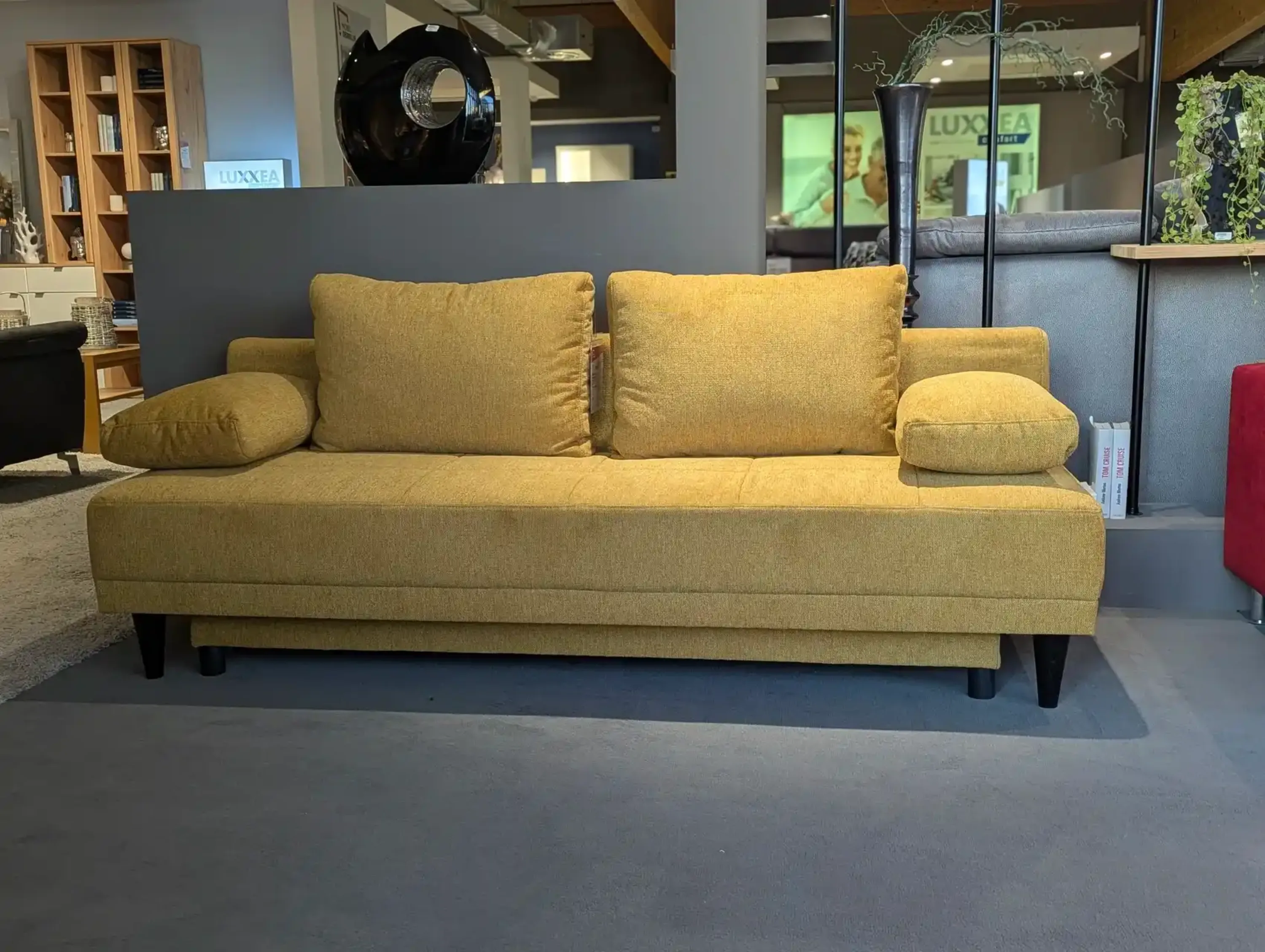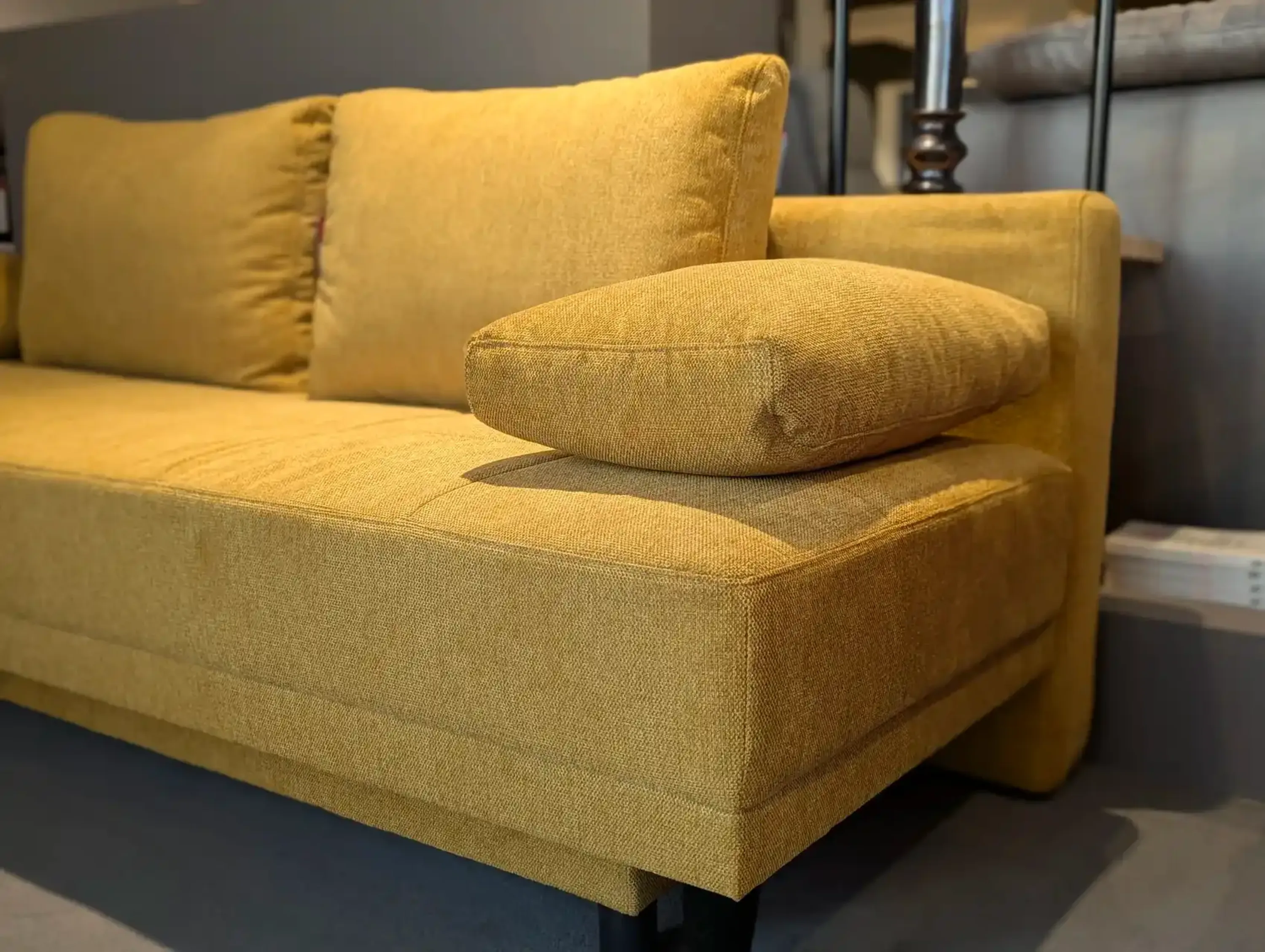 Dieses moderne Schlafsofa ohne Armteile überzeugt durch klare Linien und hohe Funktionalität. Die integrierte Hub-Bett-Mechanik ermöglicht eine komfortable Umwandlung vom Sofa zum Bett, während der integrierte Stauraum zusätzlichen Platz für Decken oder Kissen bietet. Der Taschenfederkern sorgt für angenehmen Sitz- und Liegekomfort. Der Bezug in Brego curry setzt einen warmen, modernen Akzent, ergänzt durch schwarze Füße mit 16 cm Höhe.