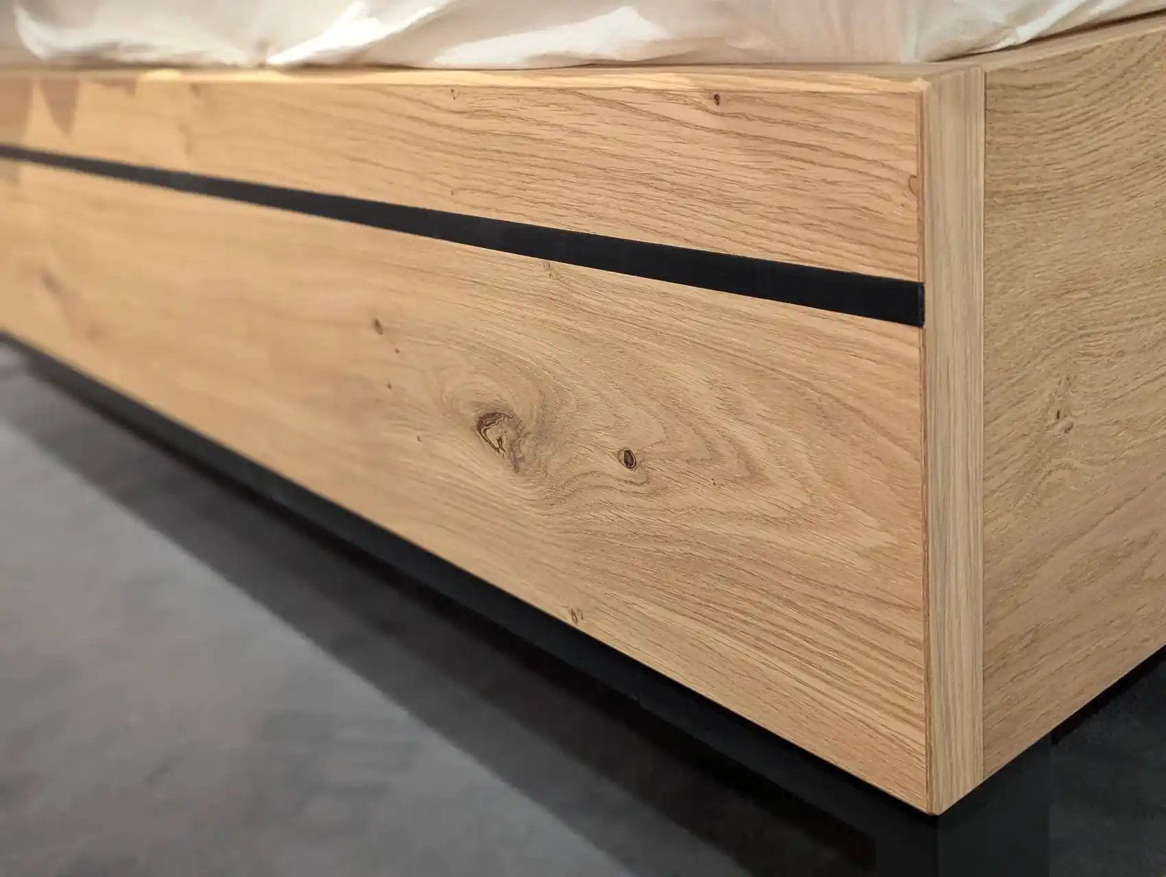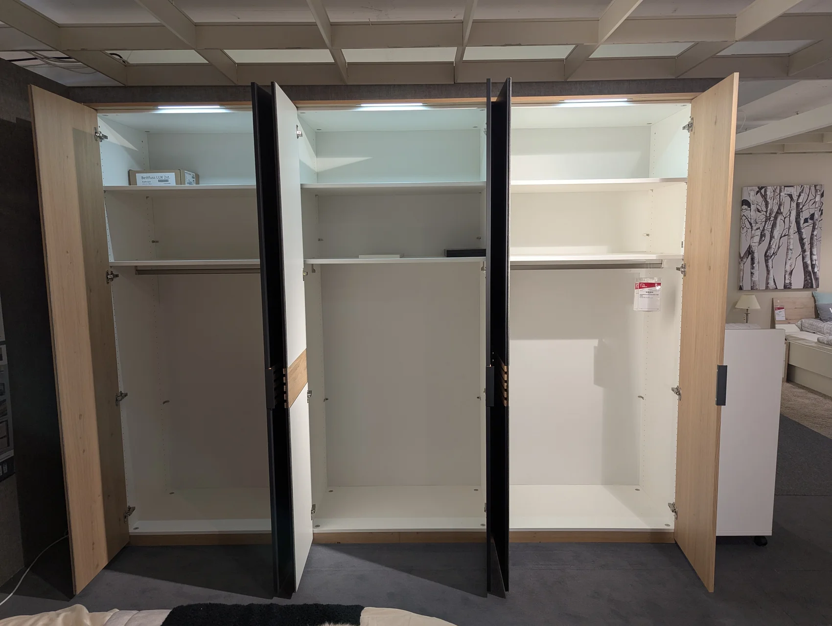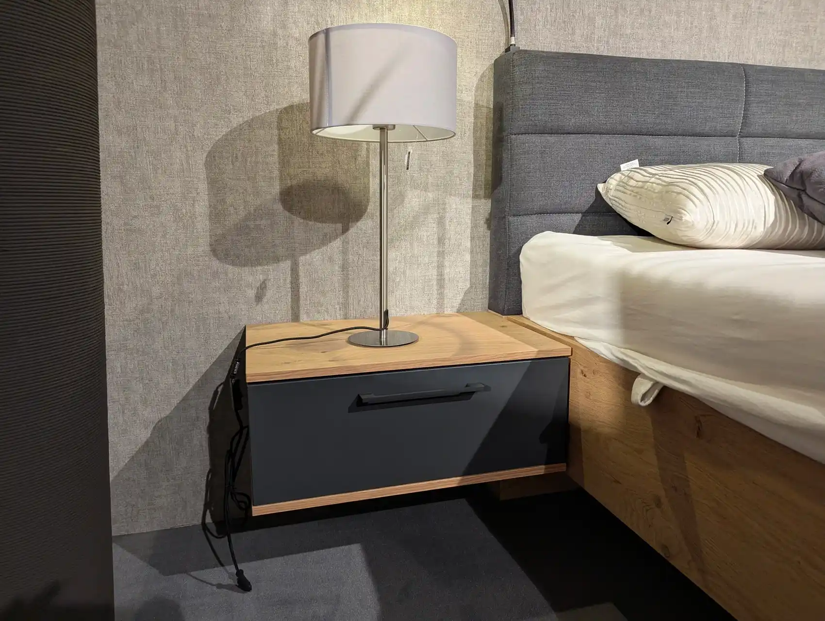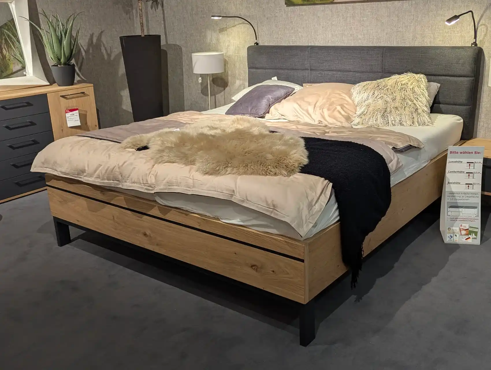 Dieses moderne Schlafzimmer-Set vereint natürliche Balkeneiche mit edlem Lack in Basalt und bietet eine perfekte Kombination aus Design und Funktionalität. Der 6-türige Drehtürenschrank bietet großzügigen Stauraum, das luxuriöse Doppelbett mit Stoffpolster sorgt für höchsten Schlafkomfort, und die hängenden Konsolenschübe sowie die Superkombikommode bieten zusätzlichen Stauraum in eleganter Optik. Die anthrazit-matten Griffe setzen stilvolle Akzente und runden das harmonische Gesamtbild ab.