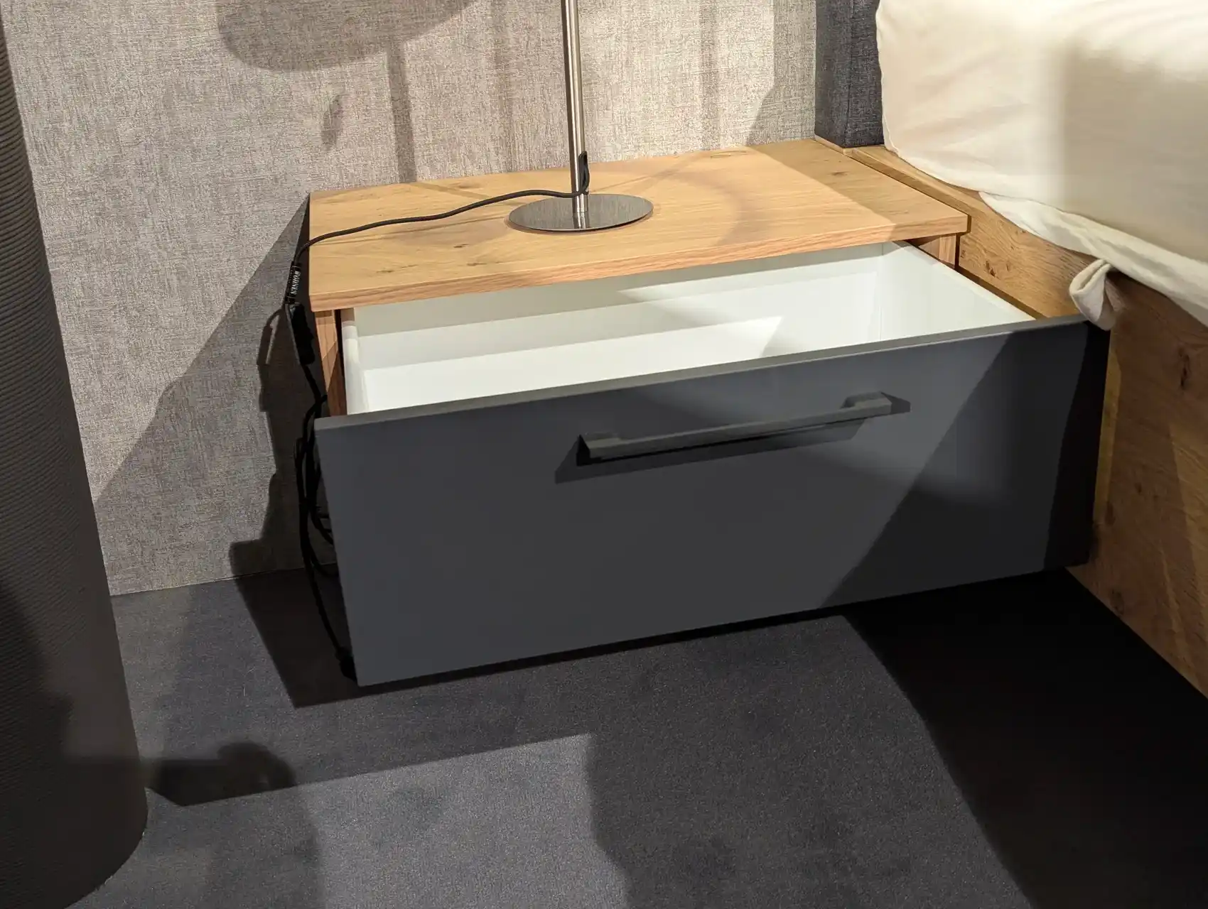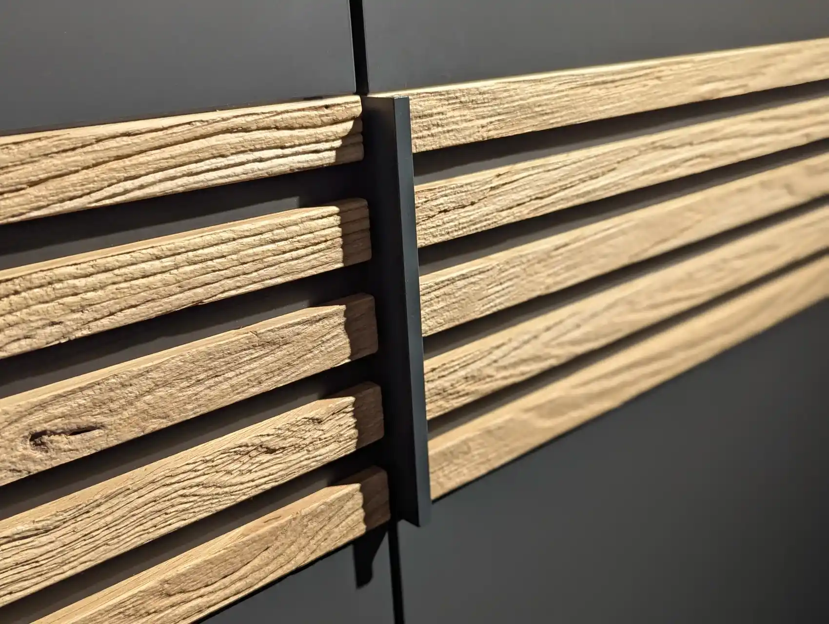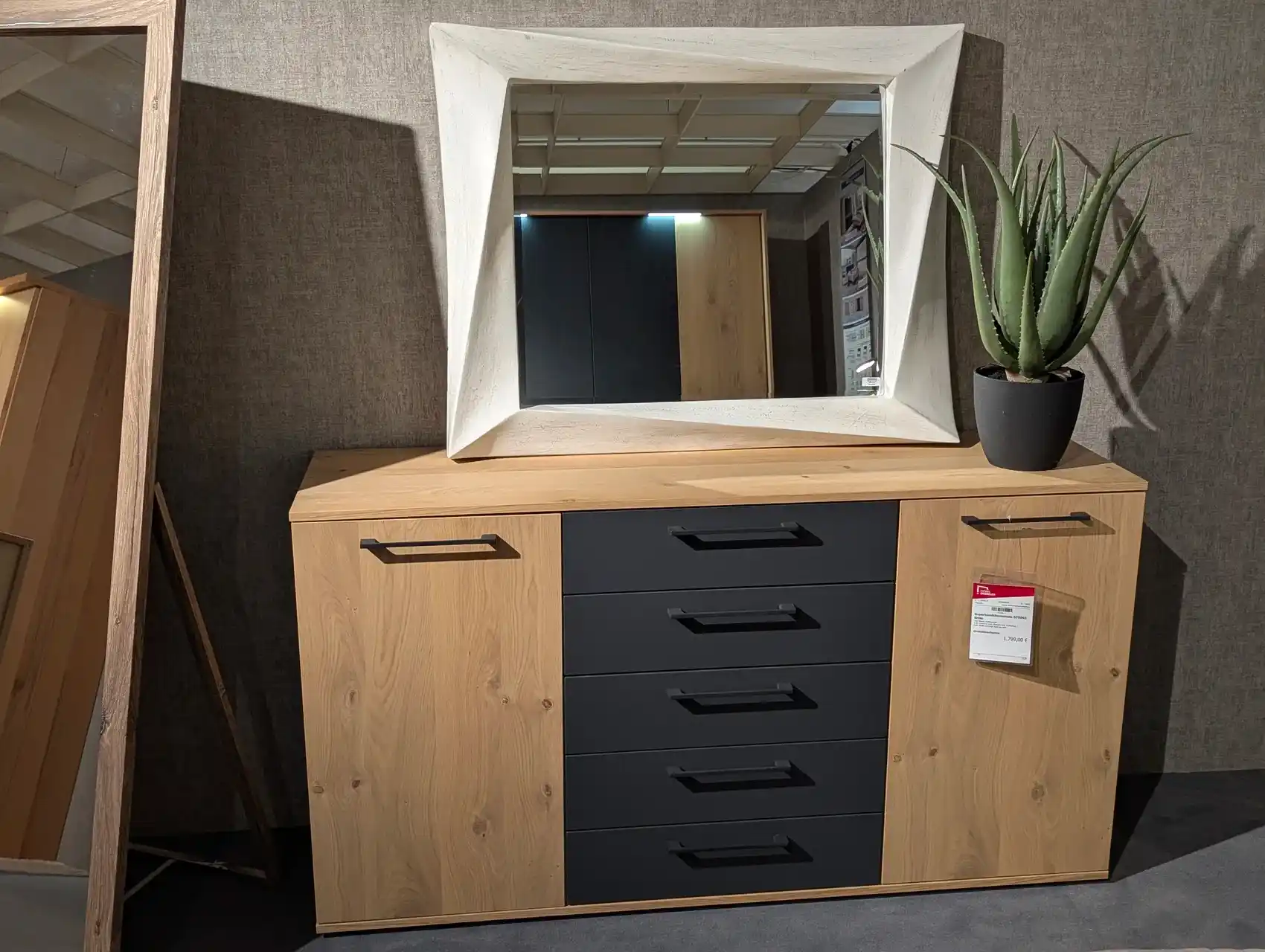 Superkombikommode: Lack Basalt / Balkeneiche, 5 Schubkästen, Vollauszug, anthrazit-matte Griffe