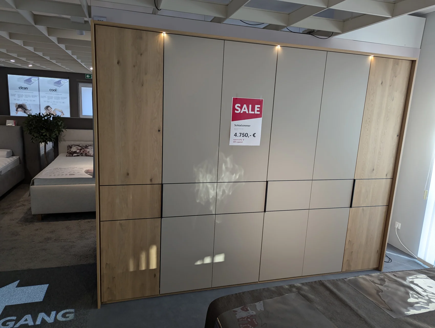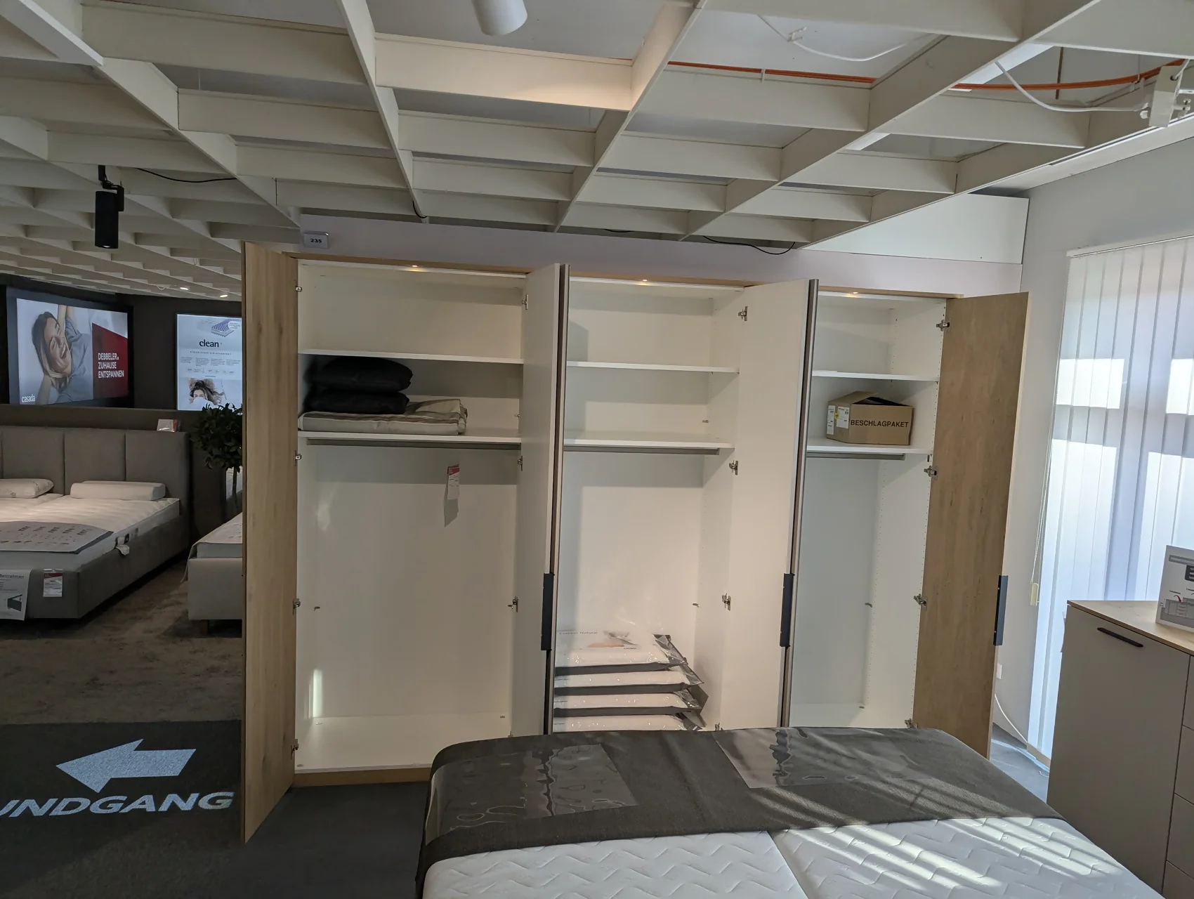 Diese hochwertige Schlafzimmerkombination vereint natürliche Materialien mit modernem Design. Der Korpus aus Balkeneiche und die Front in Lack Taupe schaffen eine warme, zeitlose Optik, während anthrazitfarbene Akzente und Griffe die elegante Erscheinung unterstreichen. Mit großzügigem Stauraum und komfortablem Luxusbett bietet die Kombination sowohl Stil als auch Funktionalität.