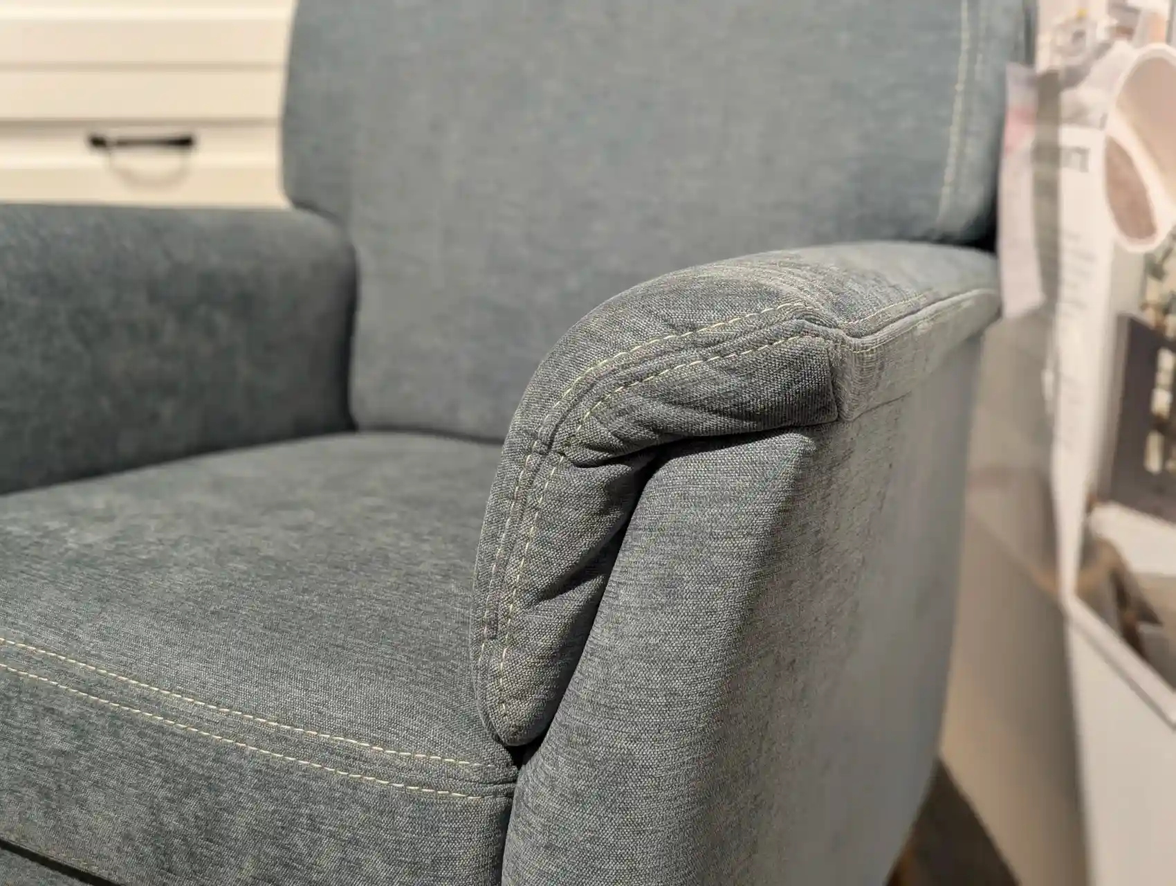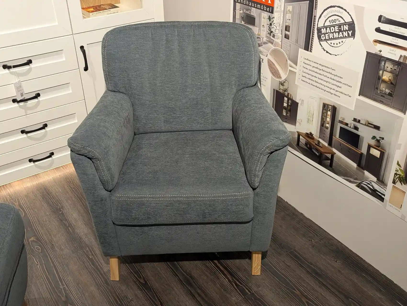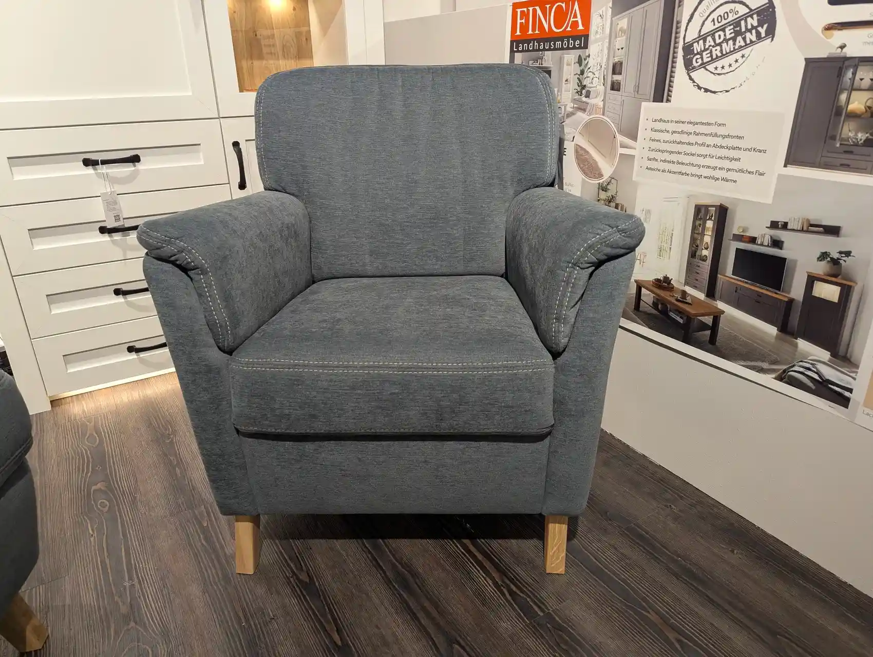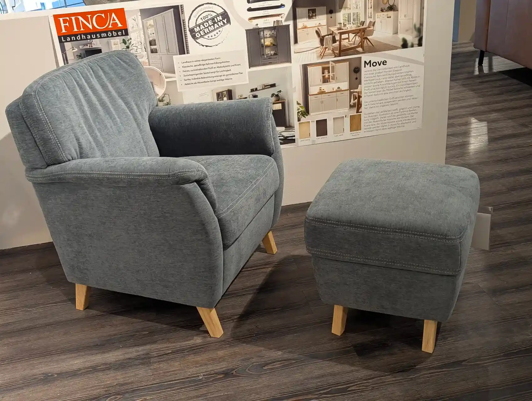 Komfortabler Sessel mit passendem Hocker im Bezug Vera Steel (12). Kontrastfäden und Doppelsteppnähte setzen dezente Akzente und unterstreichen die hochwertige Verarbeitung. Der Sitz mit Federkern sorgt für angenehmen Sitzkomfort und eine gute Unterstützung im Alltag.