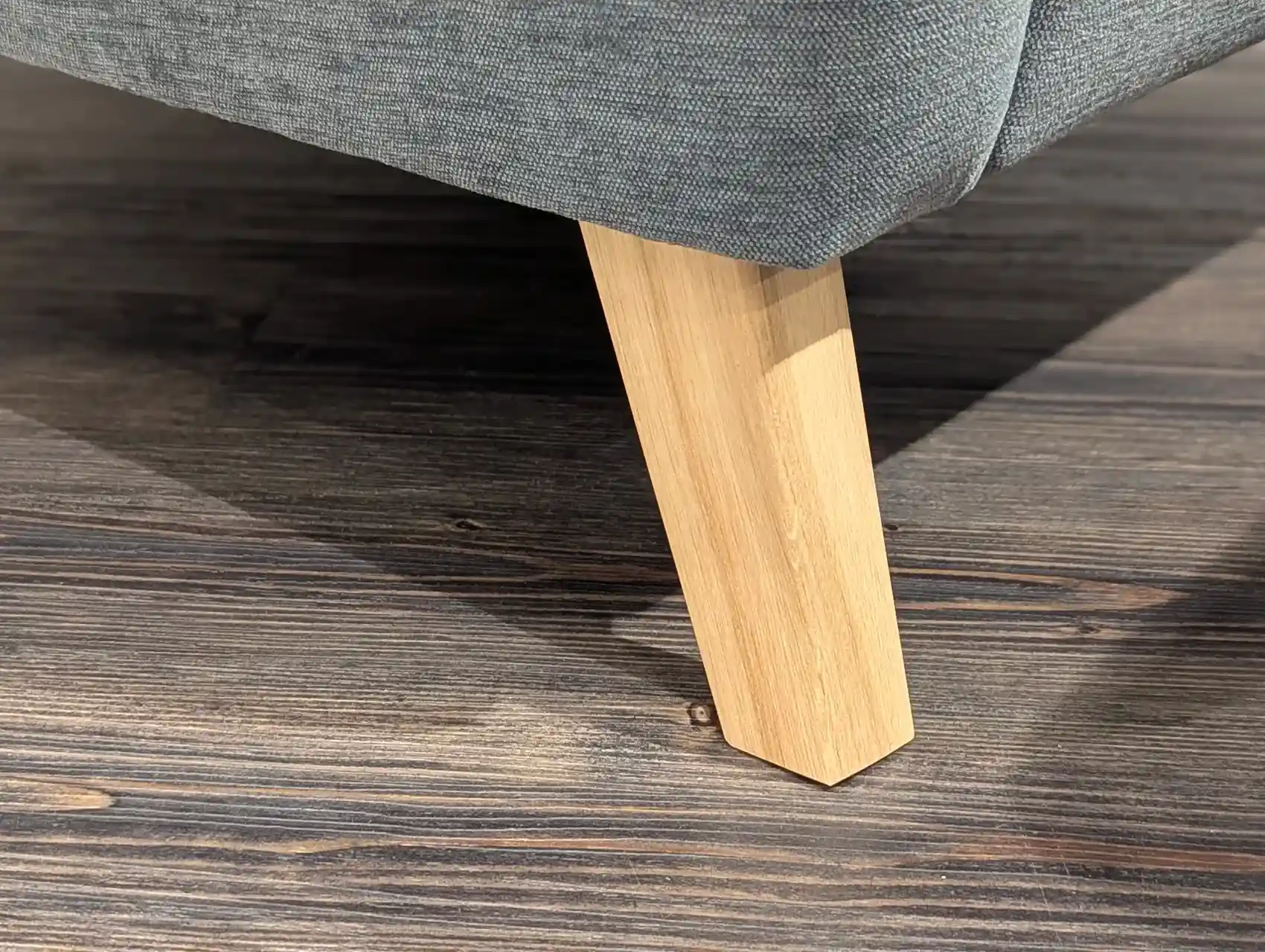 Der Hocker ist ebenfalls im gleichen Bezug ausgeführt und bietet eine komfortable Ablage für die Beine oder zusätzliche Sitzfläche. Beide Elemente stehen auf stabilen Holzfüßen aus Buche in Eiche bianco Optik (W015), die dem Möbelstück eine warme und moderne Ausstrahlung verleihen.
