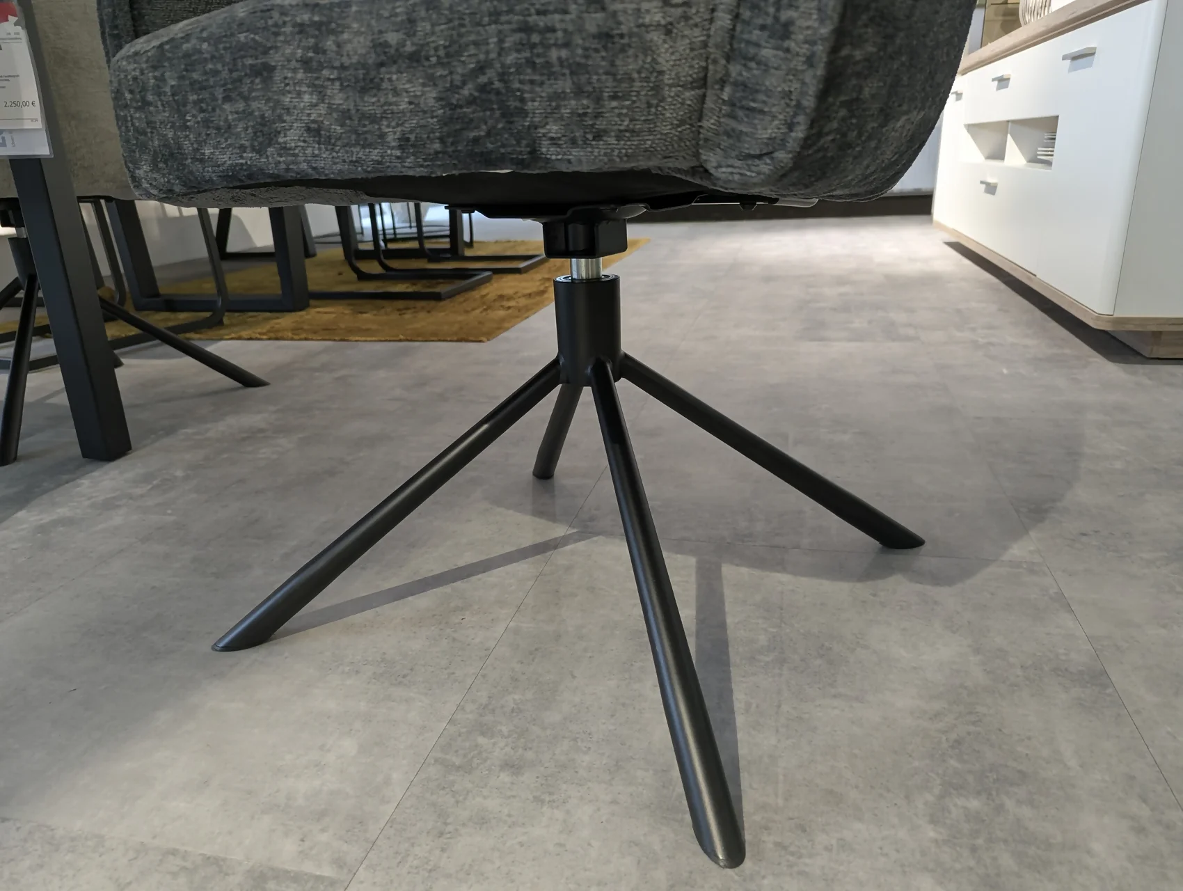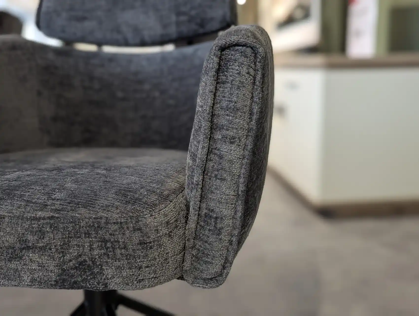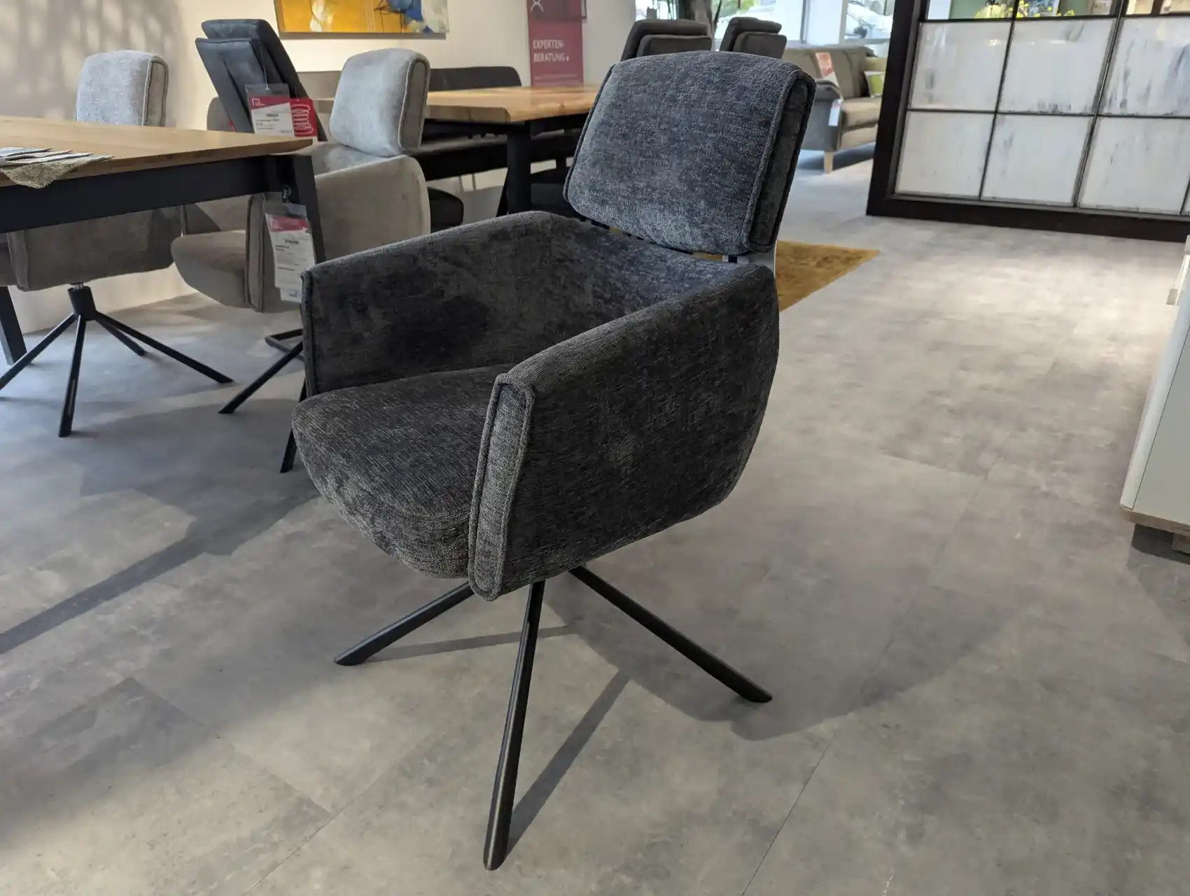Moderner Stuhl in Chenille-Optik in Anthrazit mit hochwertigem Taschenfederkern-Komfortsitz. Der Stuhl ist 360° drehbar und bietet dadurch flexible Beweglichkeit im Alltag. Die bewegliche Rückenlehne unterstützt zusätzlich den Sitzkomfort und passt sich leicht den Bewegungen an. Das Gestell in runder, konischer Form ist schwarz matt lackiert und sorgt für eine stabile, moderne Basis. Der Stuhl ist bis 120 kg belastbar und für den täglichen Gebrauch ausgelegt.