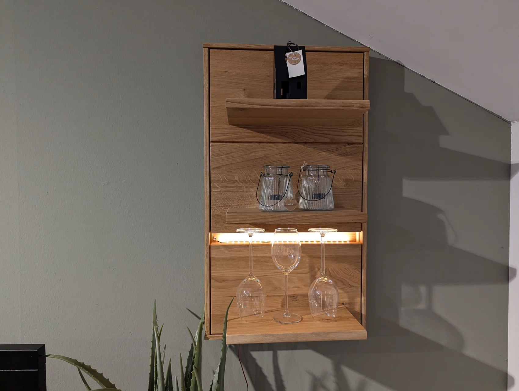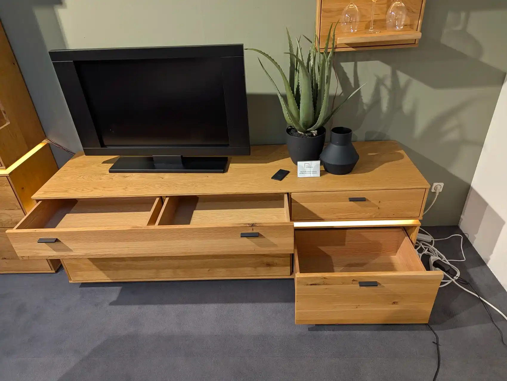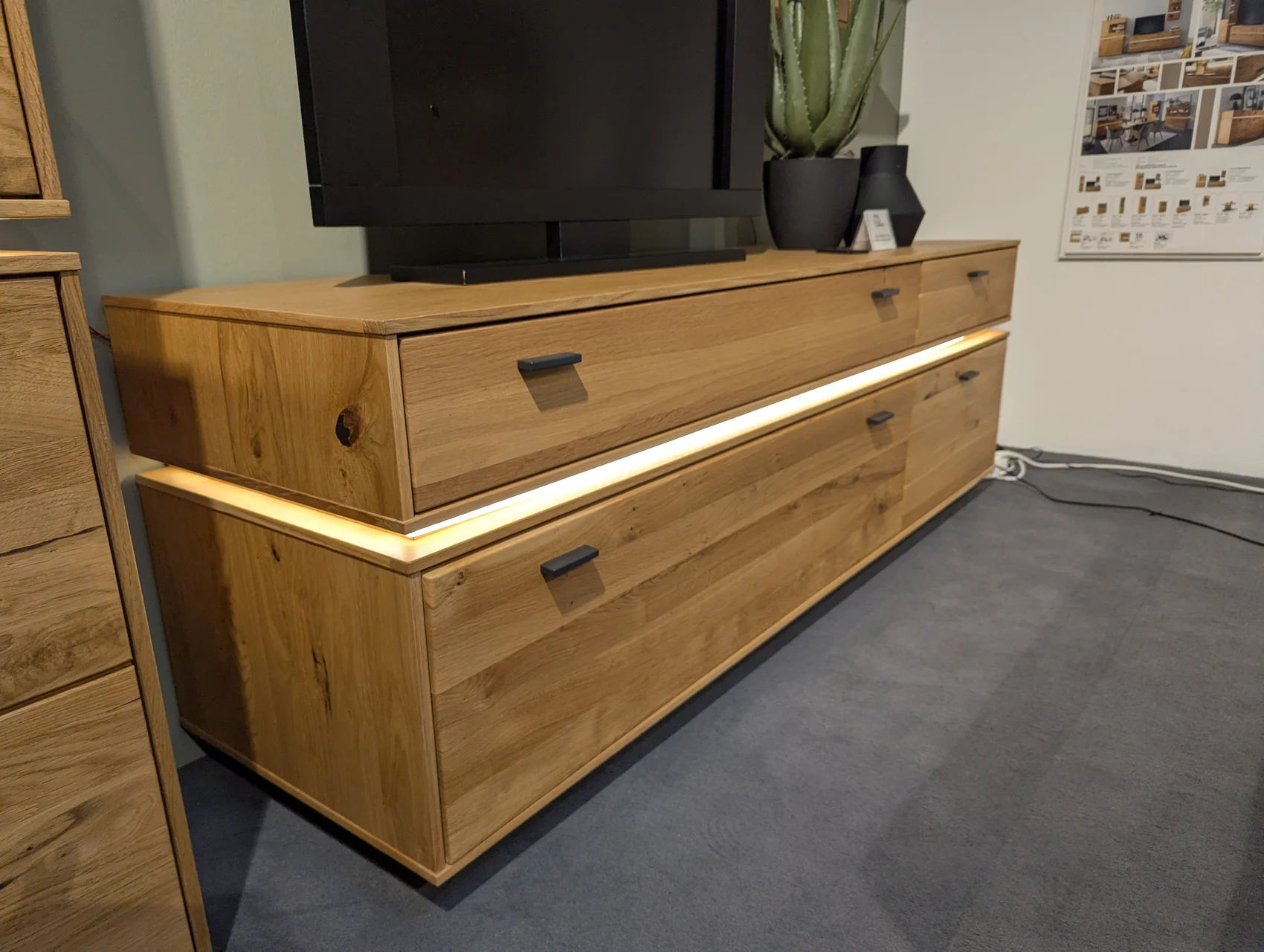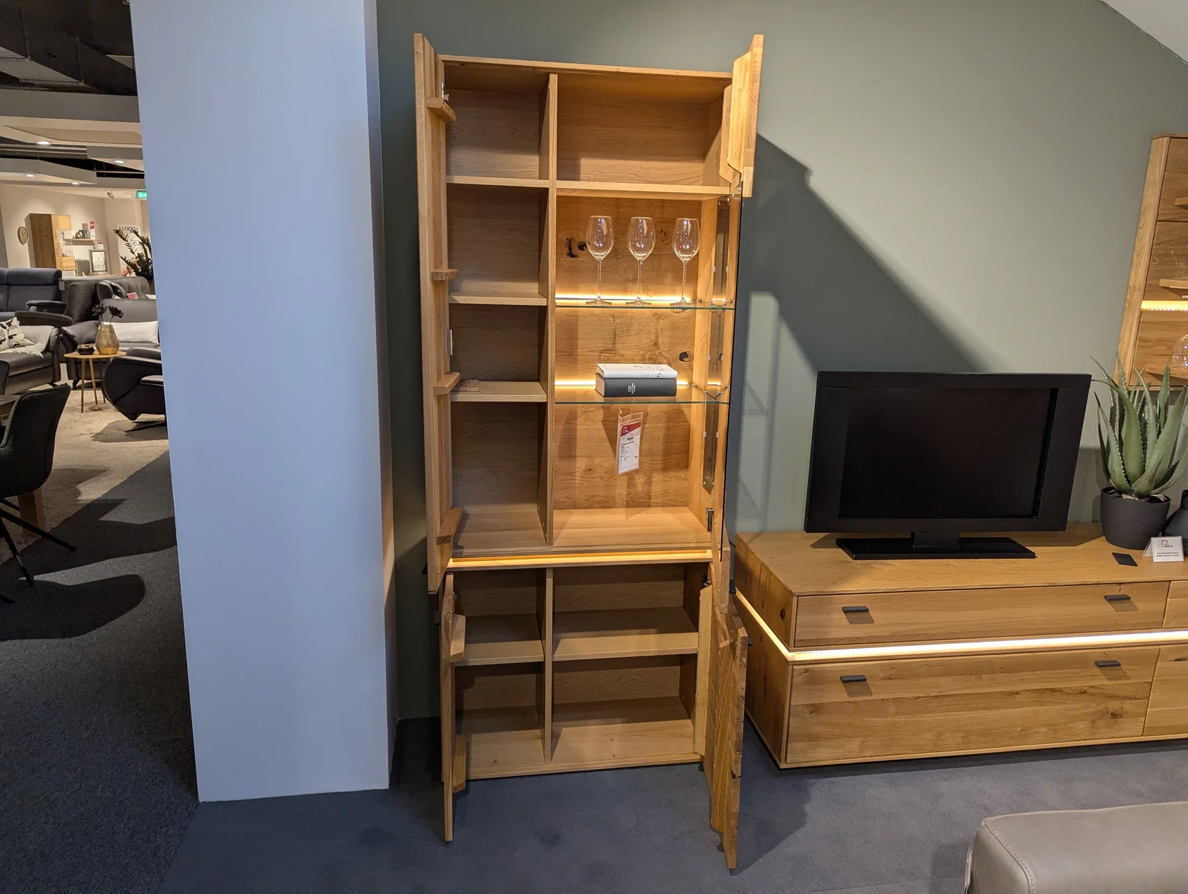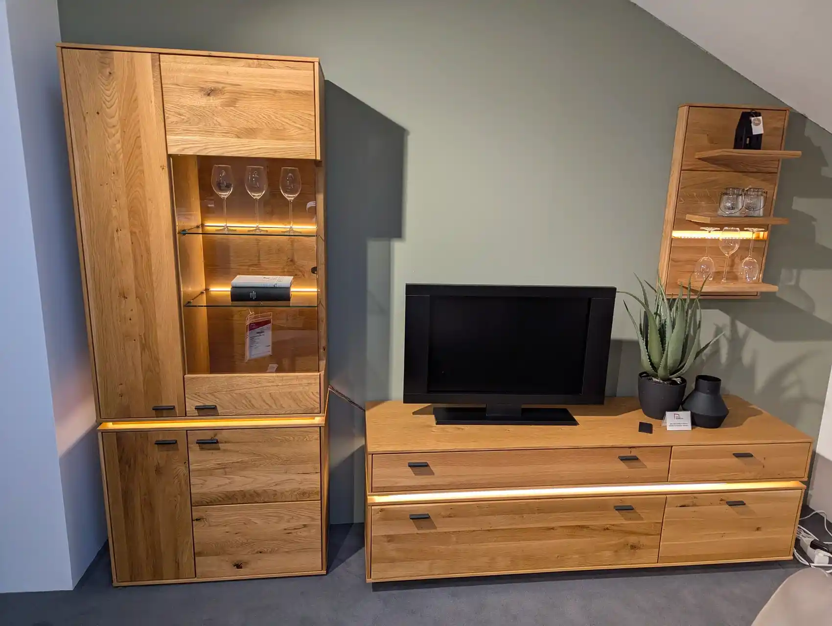 Diese Wohnkombination vereint natürliche Wildeiche mit einer geölten Oberfläche und moderner LED-Beleuchtung. Das Set umfasst eine Vitrine, ein TV-Element und ein Wandregal – alle Elemente inklusive LED, die für eine stimmungsvolle Atmosphäre sorgen. Das zeitlose Design passt perfekt in jedes Wohnzimmer und bietet gleichzeitig praktischen Stauraum und Präsentationsfläche. In unserer Filiale in Visbek können Sie die hochwertige Verarbeitung und die LED-Beleuchtung direkt erleben.