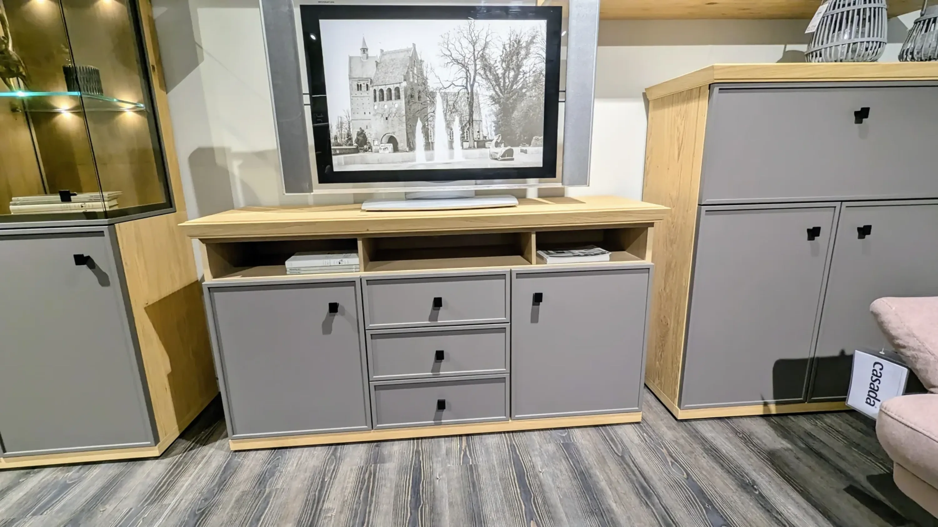 Diese stilvolle Wohnkombination aus hochwertiger Asteiche und modernem Graphit bietet eine harmonische Balance zwischen zeitlosem Design und praktischer Funktionalität. Mit eleganten Metallknopf-Griffen in Schwarz und einer Kombination aus Holztüren und Vitrinenelementen, die sowohl Stauraum als auch Präsentationsfläche bieten, ist diese Wohnkombination die perfekte Wahl für anspruchsvolle Inneneinrichtungen. Die Sockel- und Deckplatten aus massiver Asteiche verleihen Stabilität und unterstreichen die natürliche Schönheit des Holzes. Die vielseitige Komposition aus Standelementen, Abschlussvitrine und Lowboard schafft ein durchdachtes Wohnmöbel-Set, das sich ideal in moderne Wohnkonzepte einfügt.