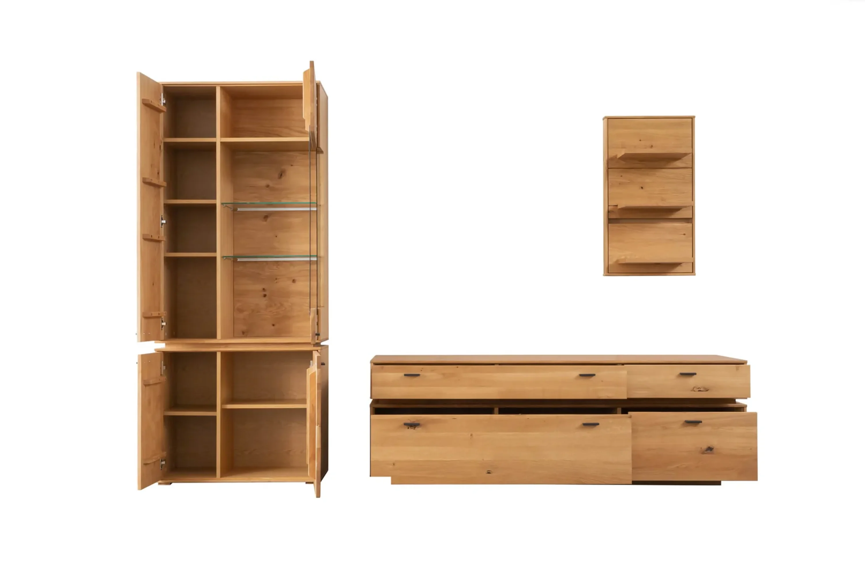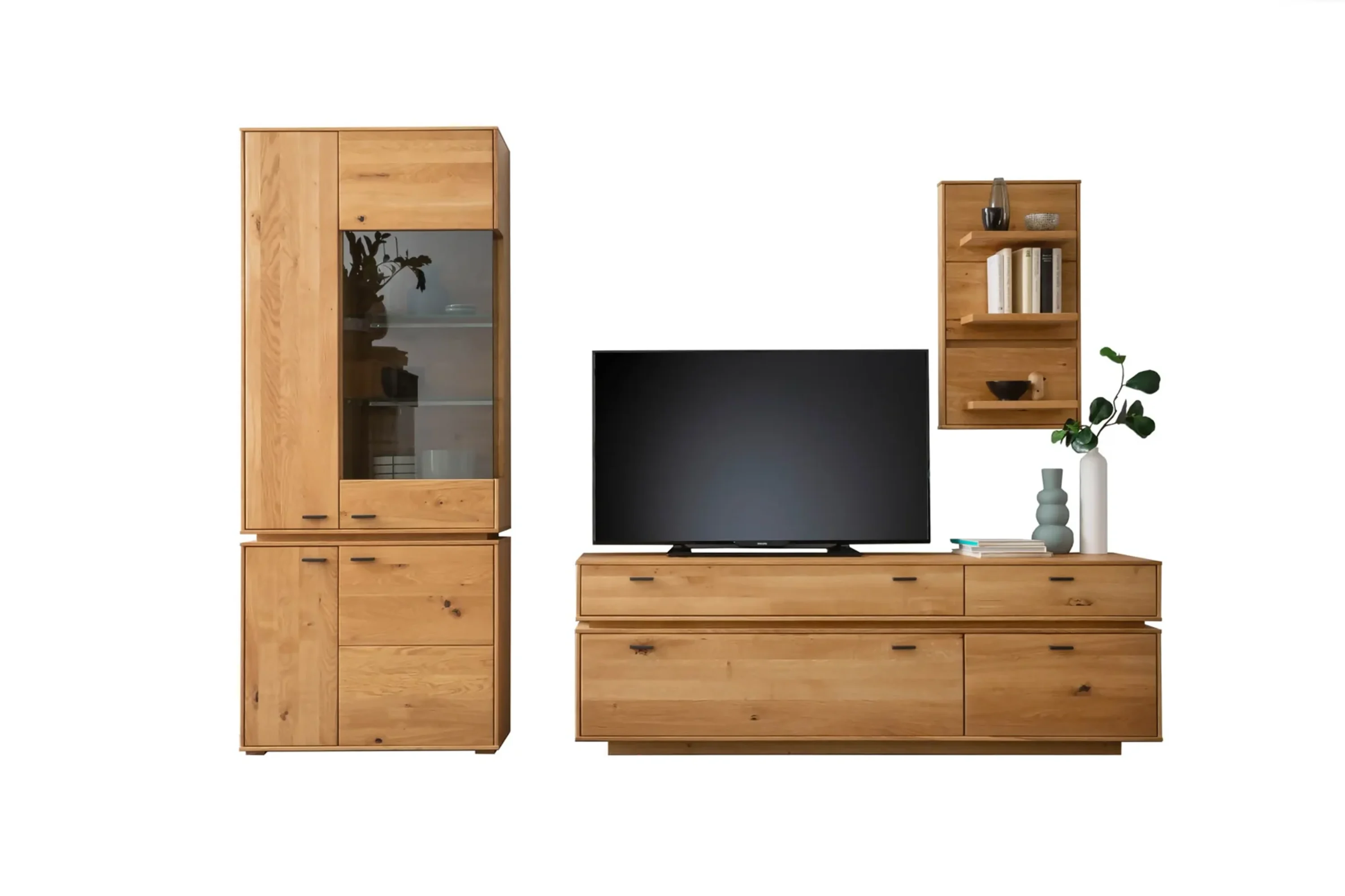Diese elegante Wohnkombination aus massiver Wildeiche bringt natürliche Wärme in Ihr Zuhause. Die durchgehenden Lamellen in der Front sind geölt und strahlen eine hochwertige, langlebige Qualität aus. Der Korpus ist ebenfalls in Wildeiche furniert und geölt, was das edle Design abrundet. Eine integrierte LED-Beleuchtung setzt das Möbelstück stimmungsvoll in Szene. Die Rückwand ist aus Asteiche furniert, während die Fronten mit Parsol-Glas und Klarglasböden versehen sind. Die anthrazitfarbenen Metallgriffe ergänzen das moderne Design. Die Kombination besteht aus einer Kombi-Vitrine, einem TV-Element und einem Wandregal.