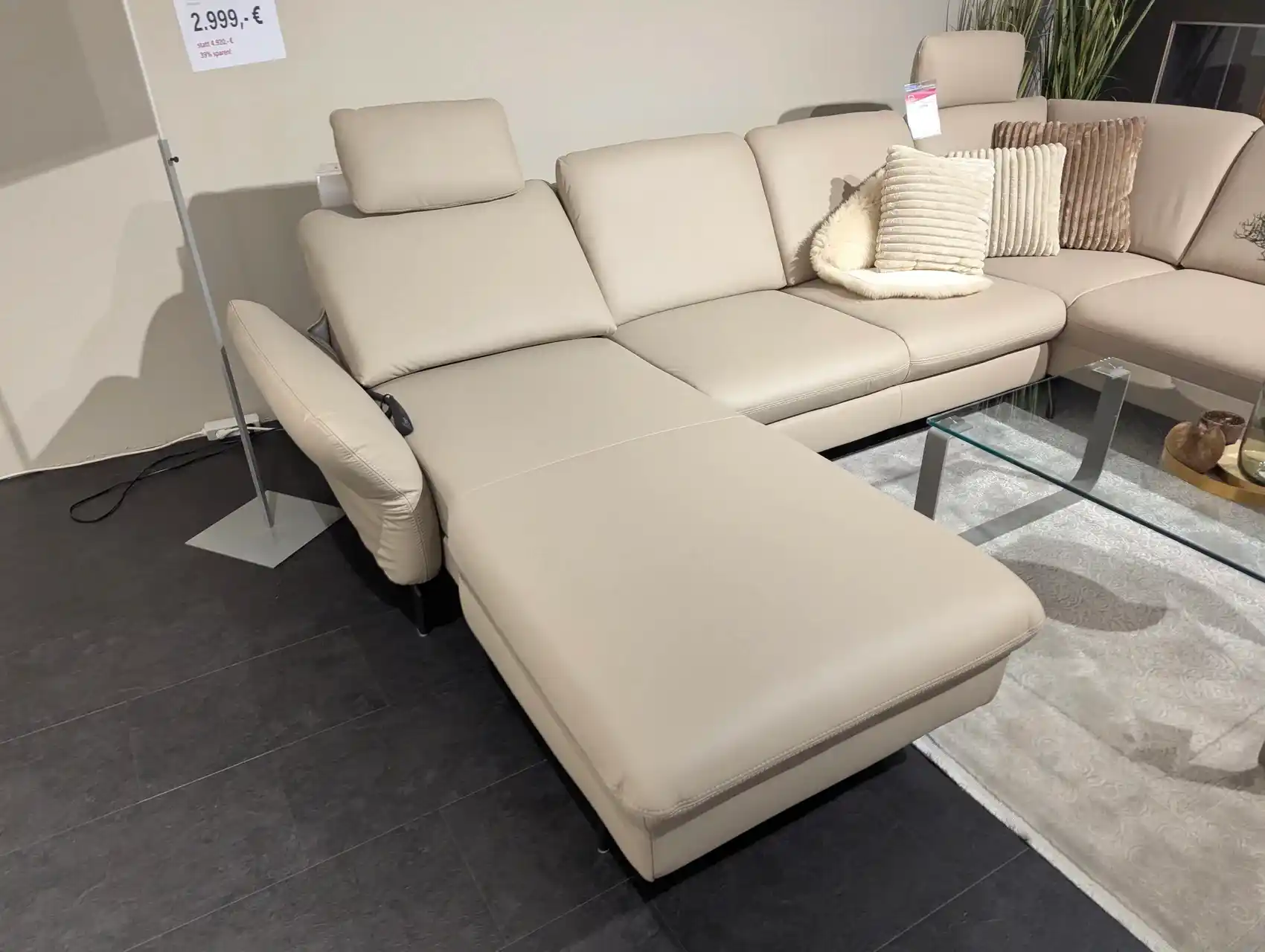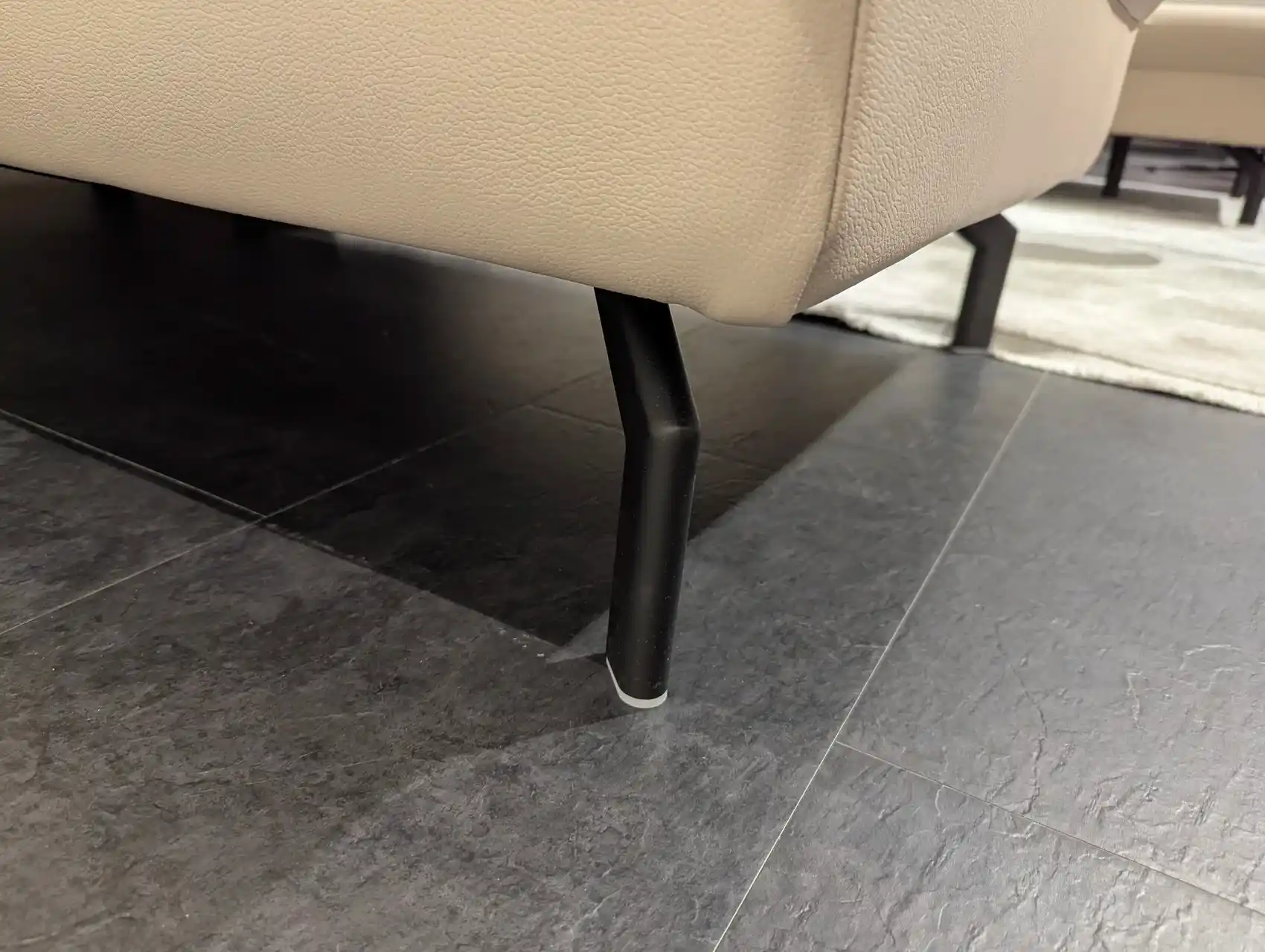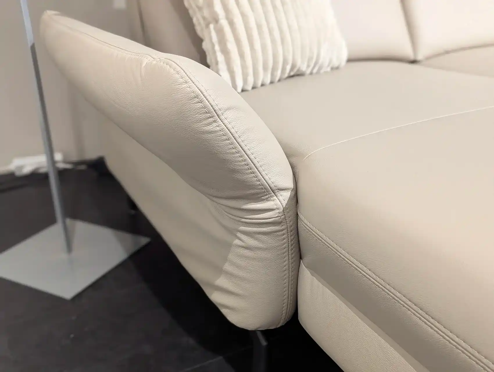 Wohnlandschaft in Leder Torro Pearl (100) mit Federkern-Sitzkomfort und moderner Funktionsausstattung. Der Rücken ist echt bezogen und ermöglicht eine flexible Platzierung im Raum. Die Kombination besteht aus Canape mit motorischer Liegeposition und linker Armlehne, einem 2,5-Sitzer mit Querschläfer-Funktion sowie einem 1-Sitzer Kombielement mit Anstellhocker rechts. Die Sitzhöhe beträgt jeweils ca. 45 cm und sorgt für angenehmes Sitzen im Alltag. Das Metallgestell in Schwarz (W001) unterstreicht das moderne Design und bietet stabile Unterstützung.