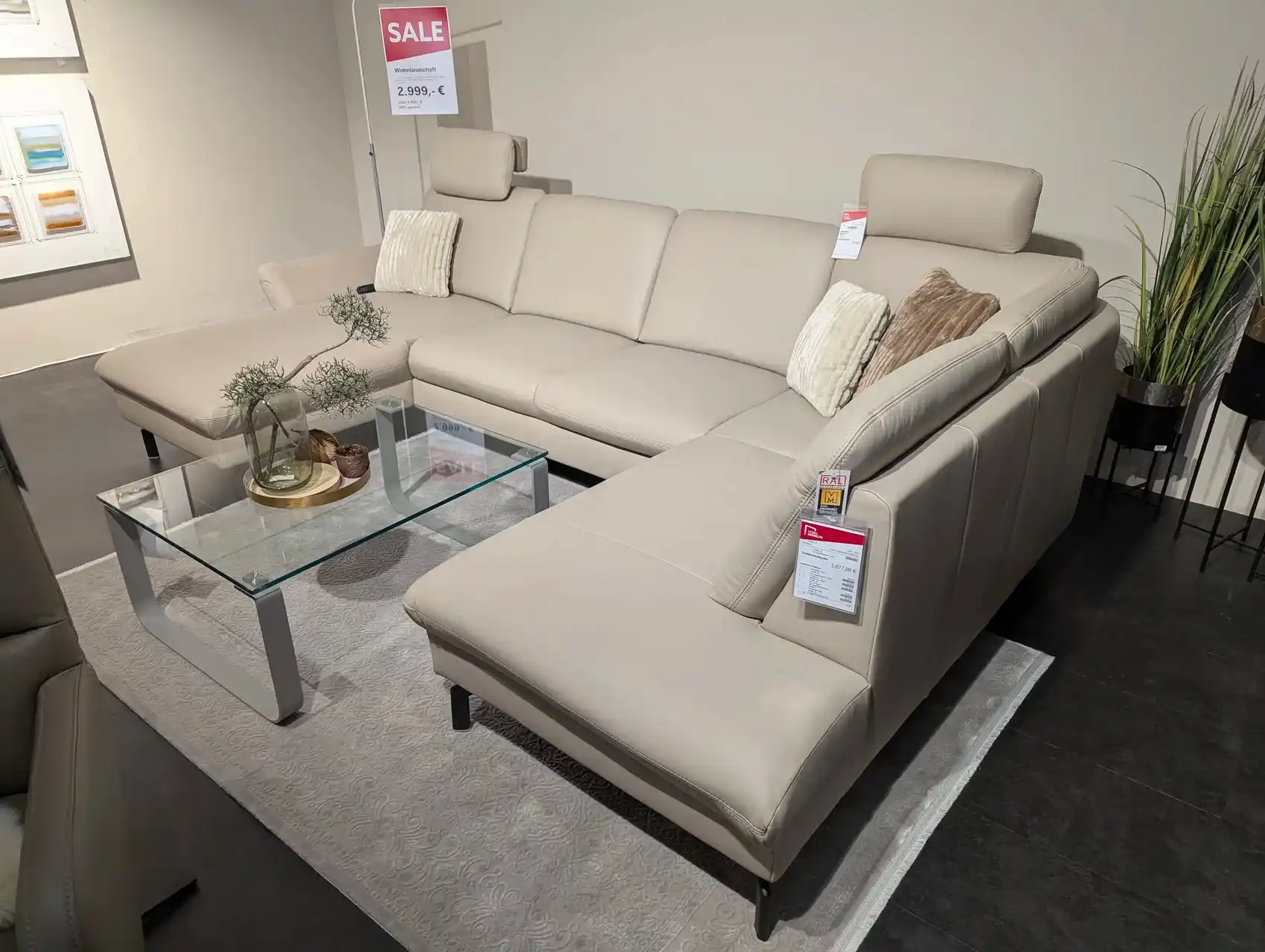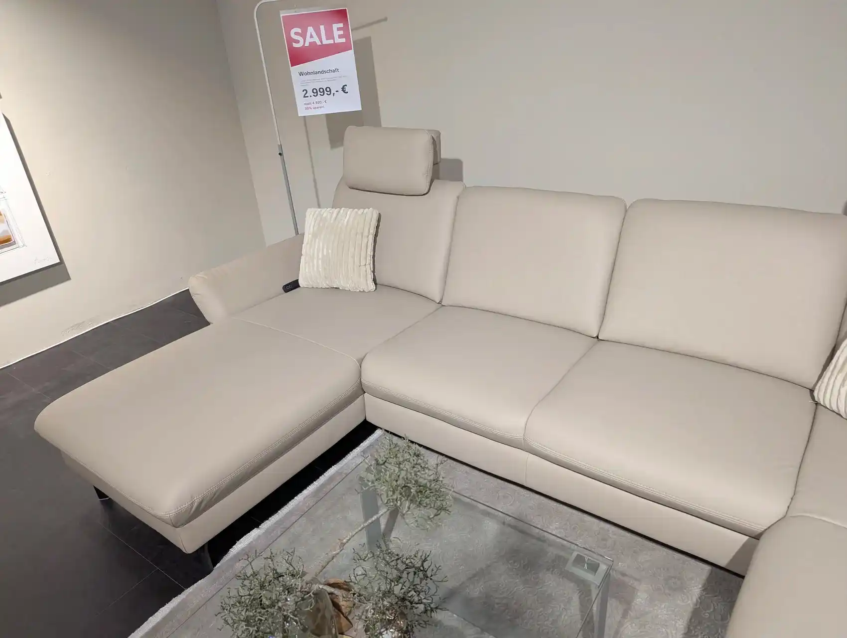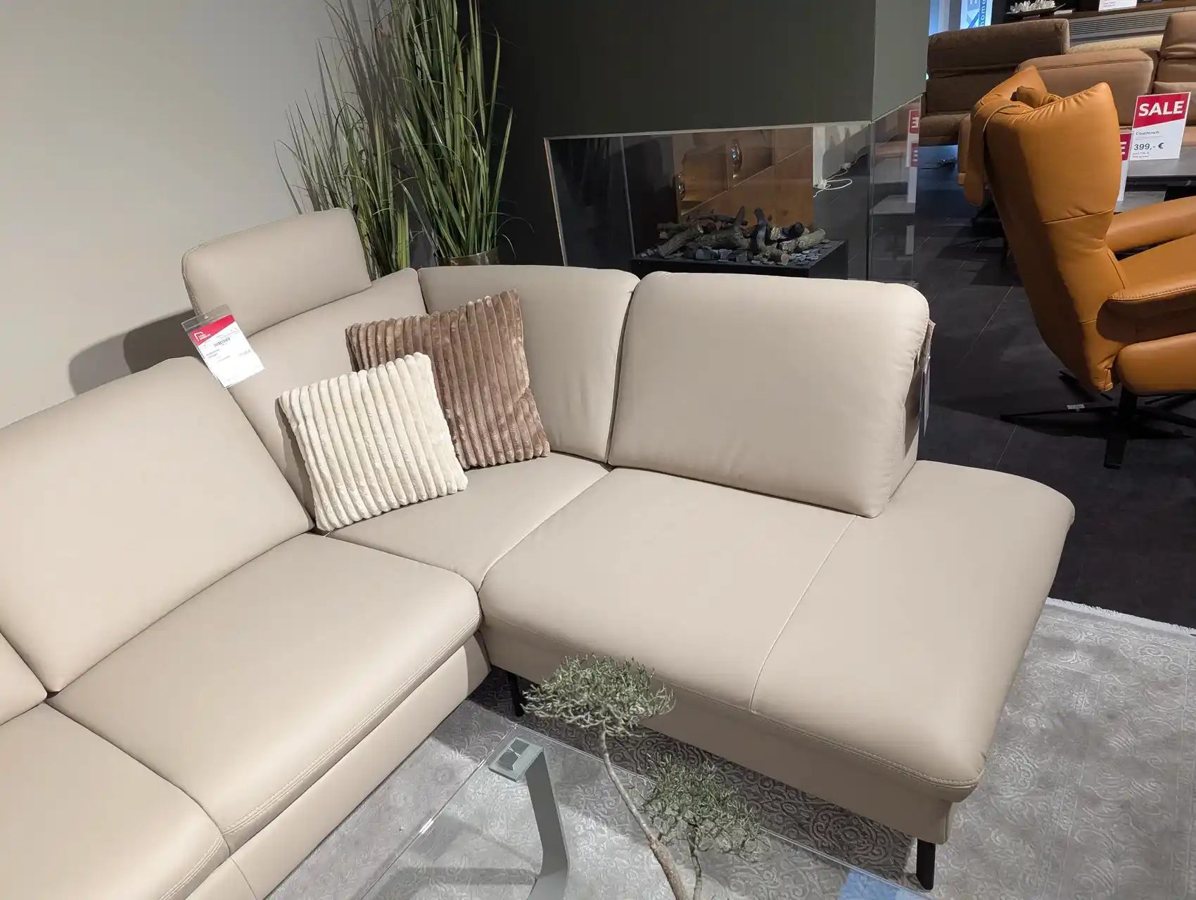 Wohnlandschaft in Leder Torro Pearl (100) mit Federkern-Sitzkomfort und moderner Funktionsausstattung. Der Rücken ist echt bezogen und ermöglicht eine flexible Platzierung im Raum. Die Kombination besteht aus Canape mit motorischer Liegeposition und linker Armlehne, einem 2,5-Sitzer mit Querschläfer-Funktion sowie einem 1-Sitzer Kombielement mit Anstellhocker rechts. Die Sitzhöhe beträgt jeweils ca. 45 cm und sorgt für angenehmes Sitzen im Alltag. Das Metallgestell in Schwarz (W001) unterstreicht das moderne Design und bietet stabile Unterstützung.
