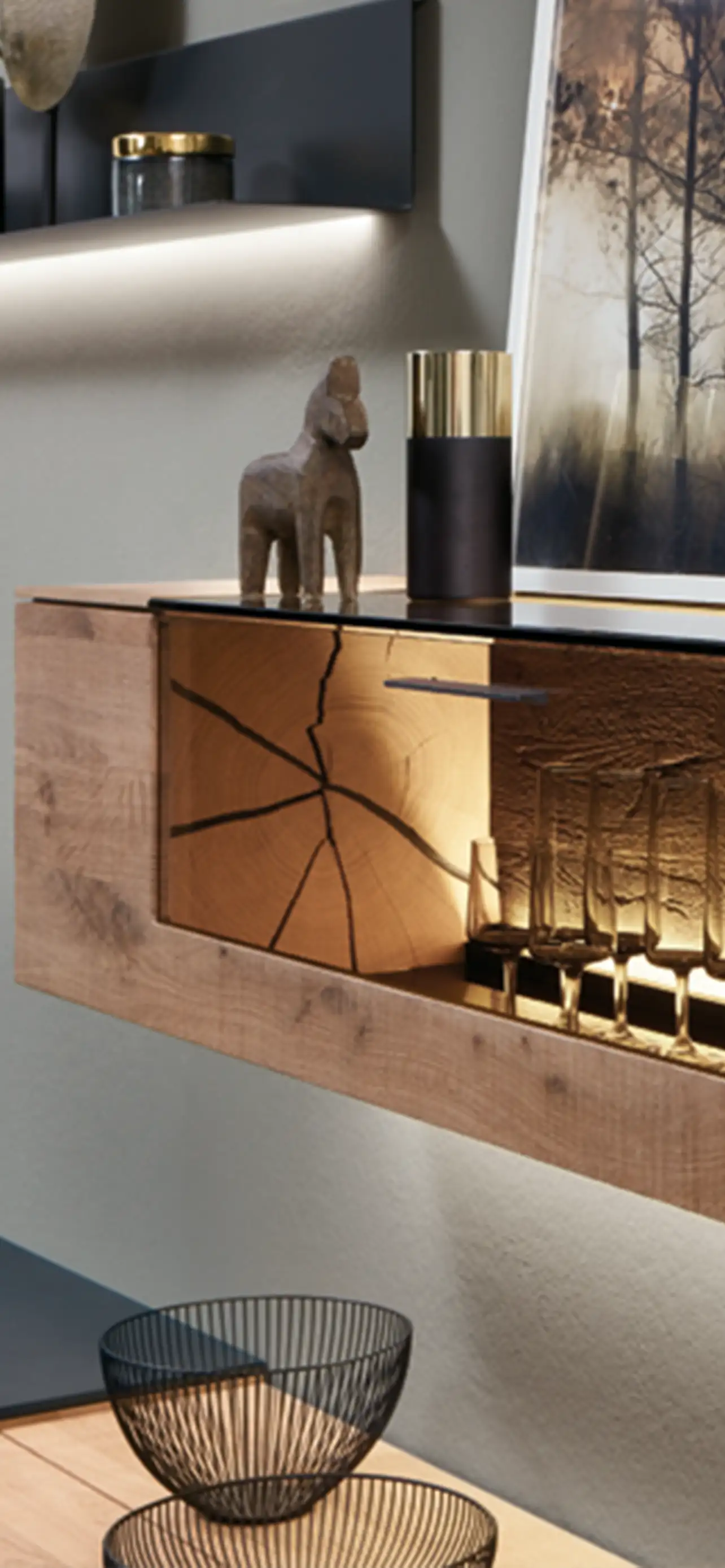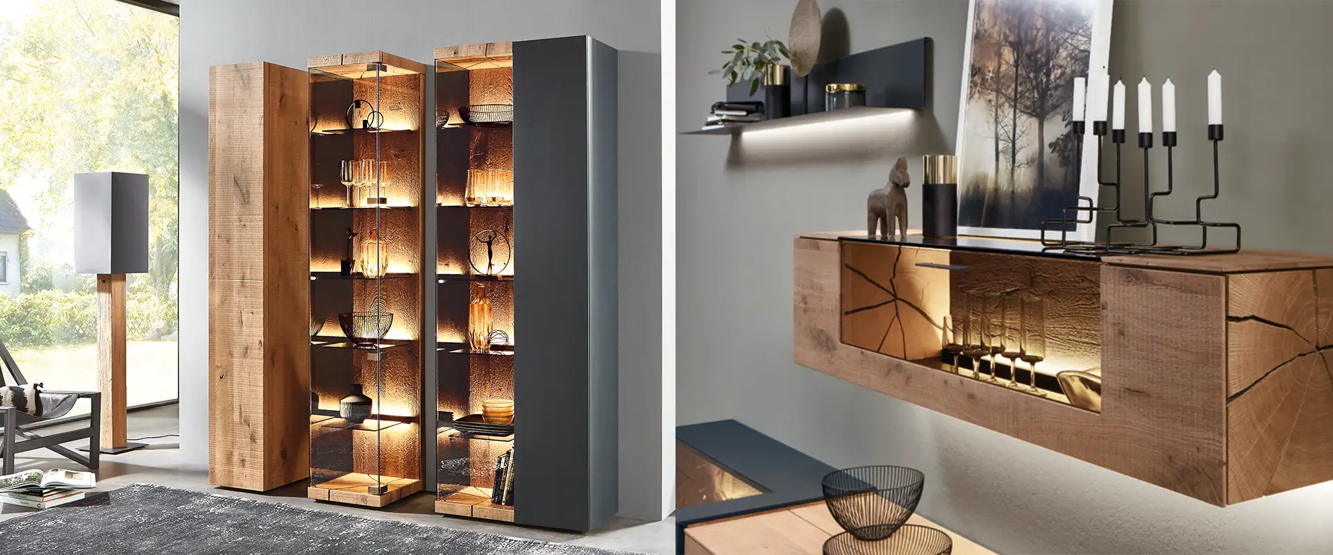 Die Zeiten der massiven Schrankwände sind vorüber, locker gestellte Wohnwände sorgen heute dafür, dass alle wichtigen Utensilien, sei es Unterhaltungselektronik, Bücher, Dekoration oder Nippes ihren Platz finden. Holz als Hauptmaterial ist dabei nie aus der Mode gekommen und zeigt sich in den unterschiedlichsten Ausführungen stets zeitlos. Liebevoll dekoriert und atmosphärisch beleuchtet zieht die Wohnwand alle Blicke auf sich, auch wenn der Fernseher nicht angeschaltet ist.